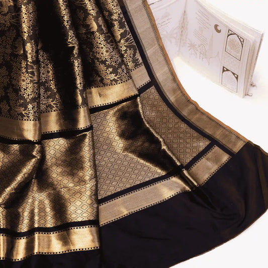 Black Banarasi Silk Shikaargah Saree Showcasing Flora and Fauna