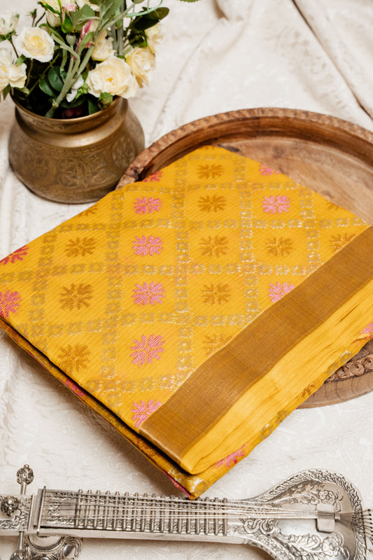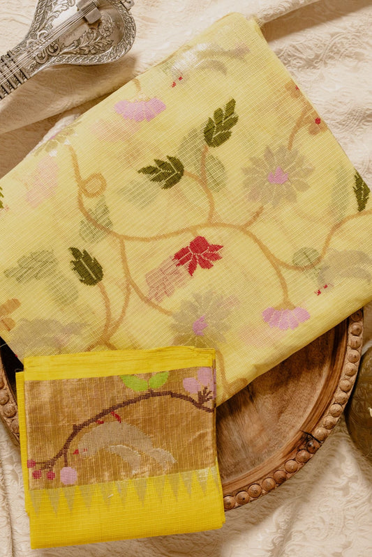Lemon Yellow Zari Kota Saree with Paithani Floral