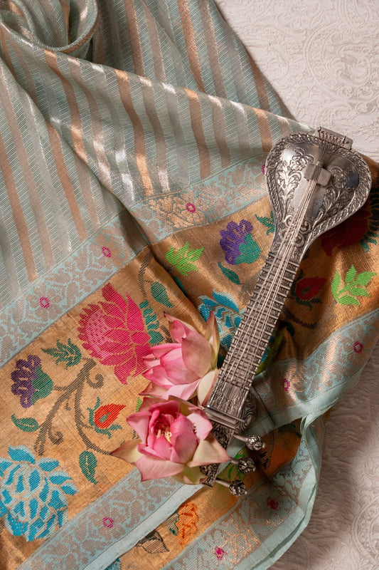 Sky Blue Real Zari Tissue Kota Saree with Lehariya Stripes & Paithani BorderRegular price ₹133,300Regular priceUnit price / per₹133,300Sale price ₹133,300