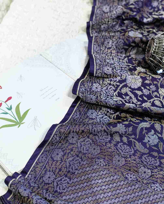 Dark Purple Banarasi Silk Jamdani Saree with Zari Florals and BirdsRegular price ₹63,000Regular priceUnit price / per₹63,000Sale price ₹63,000