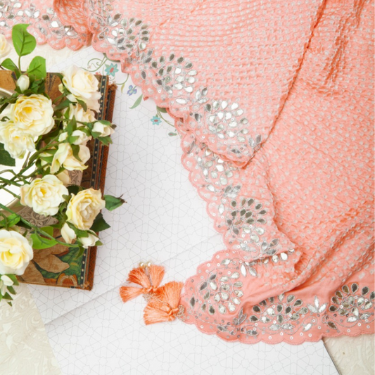 Hand Embroidered Peach Bandhani With Gota Patti Dupatta
