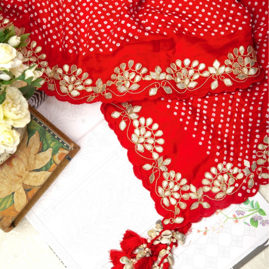 Hand Embroidered Red Bandhani With Gota Patti Dupatta