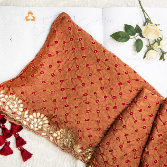 Hand Embroidered Burnt Sienna Bandhani With Gota Patti Dupatta