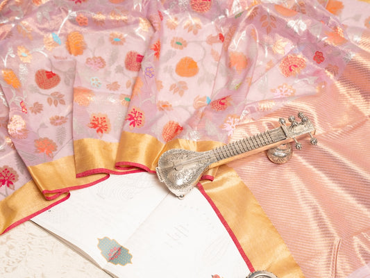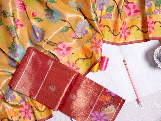 Kota Doria sarees are beautiful traditional Indian sarees made from a light and breathable fabric called Kota Doria. This fabric is woven in Kota, Rajasthan, and has a sheer texture with a lovely grid pattern. They’re a perfect mix of style and comfort, which is why people love wearing them for all sorts of occasions.