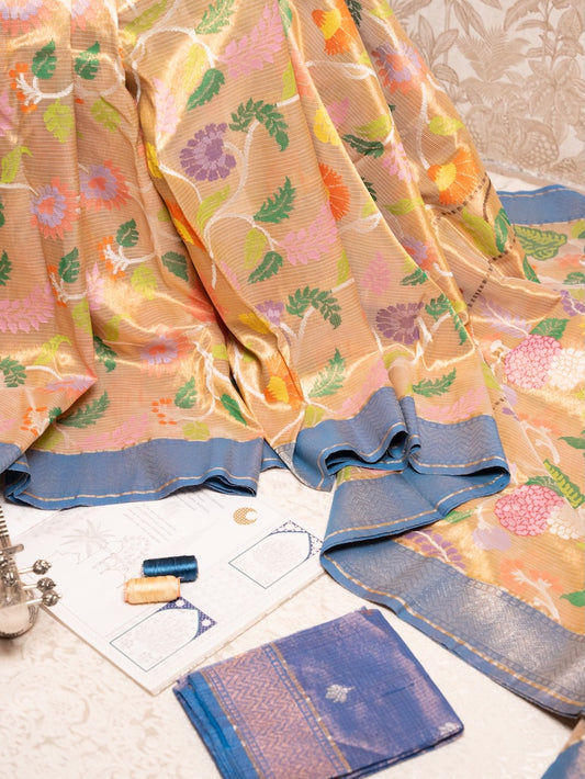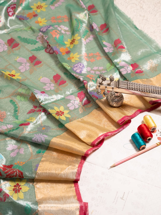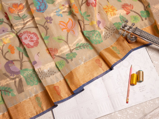Zari Kota Sarees: These are embellished with shiny zari work, making them ideal for festive occasions. You may like to check out this Real Zari handwoven Kota saree adorned with exquisite flora and fauna motifs.