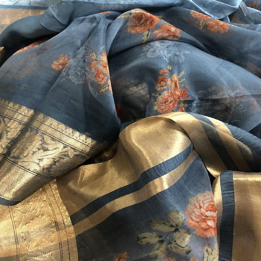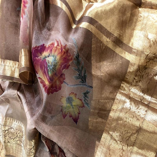 Chocolate to Salmon Pink Digital Printed Organza Saree