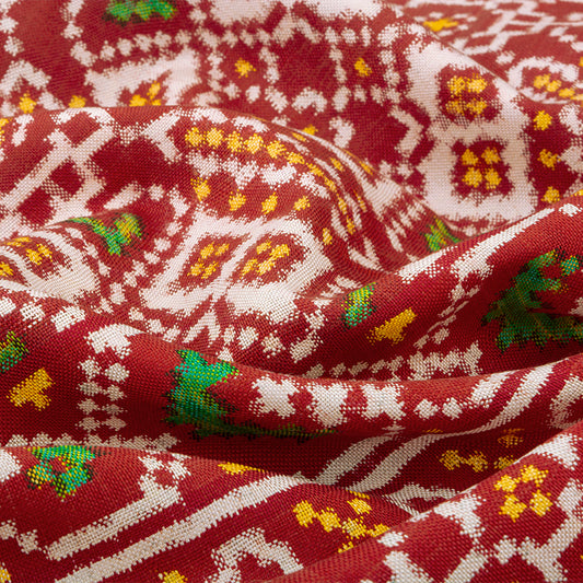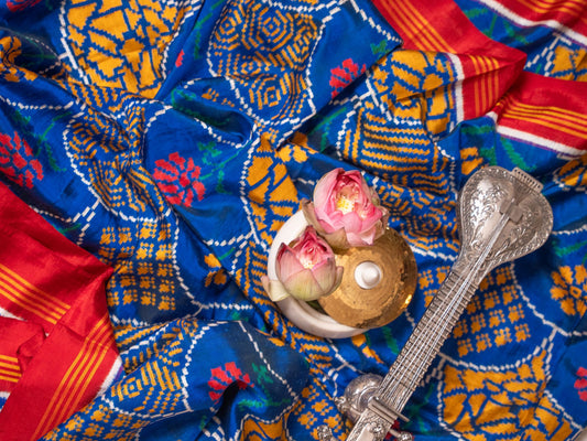 The saree is made from silk, which makes it feel smooth and luxurious. These sarees are known for their bright colors and intricate designs. Creating a Patan Patola saree takes a lot of time and skill, making them a prized possession. They are perfect for weddings and other special events and are often passed down through generations.