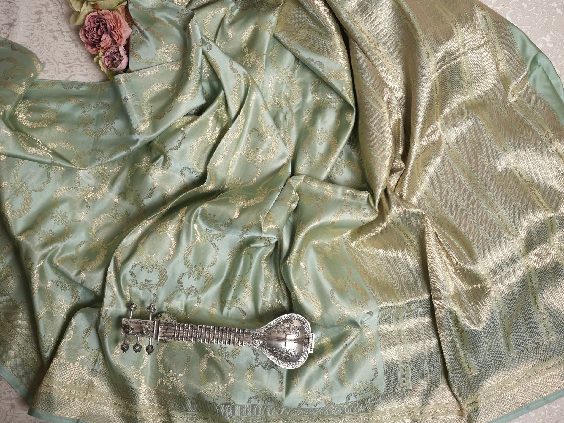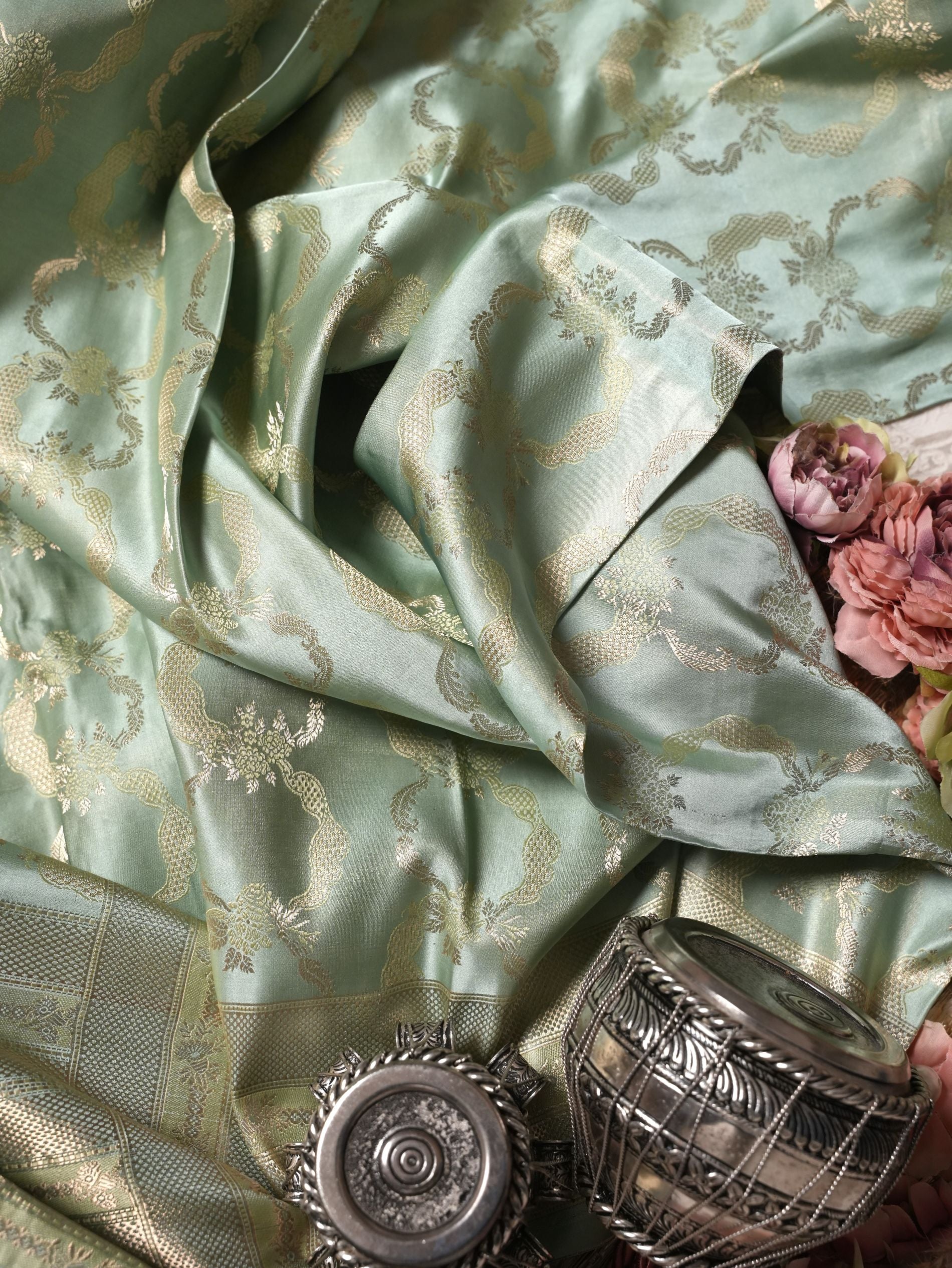 This Mint Green Silver Zari Banarasi Saree is a subtle expression of refined elegance. The cool mint base is beautifully enhanced with silver zari motifs, exuding a soft shimmer that’s perfect for both day and evening wear. The intricately woven borders and pallu showcase timeless craftsmanship, making it a sophisticated choice for weddings, receptions, and festive occasions. Its delicate pastel tone paired with lustrous zari detailing offers understated luxury.