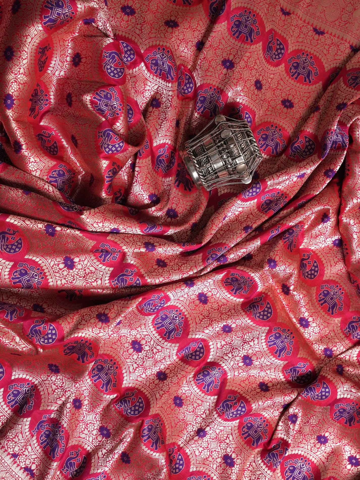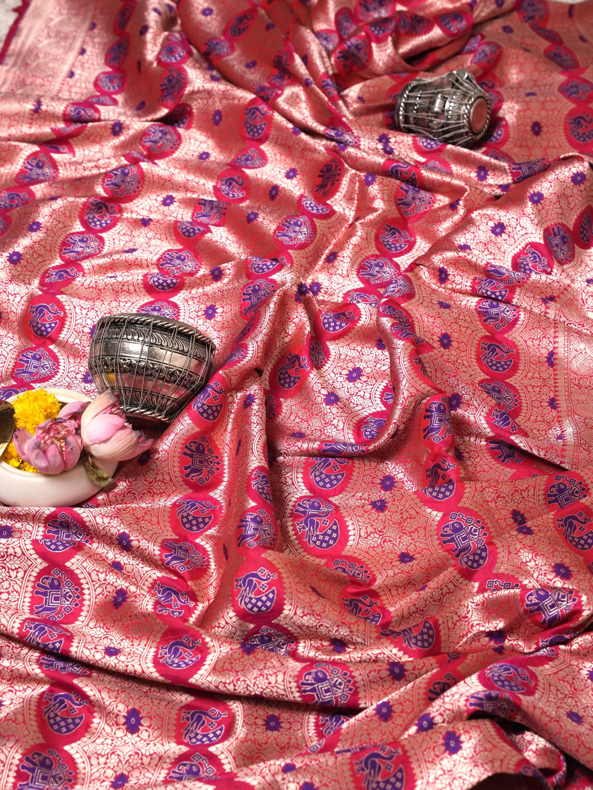 This Rani Pink Elephant Motif Banarasi Saree is a striking blend of cultural symbolism and vibrant design. The rani pink base is adorned with royal elephant motifs in deep blue, framed by golden zari circles and floral highlights. The intricate detailing symbolizes prosperity and celebration, making it ideal for weddings, cultural gatherings, and festive occasions. Its bold motifs paired with rich hues make this saree a statement piece for any special event.