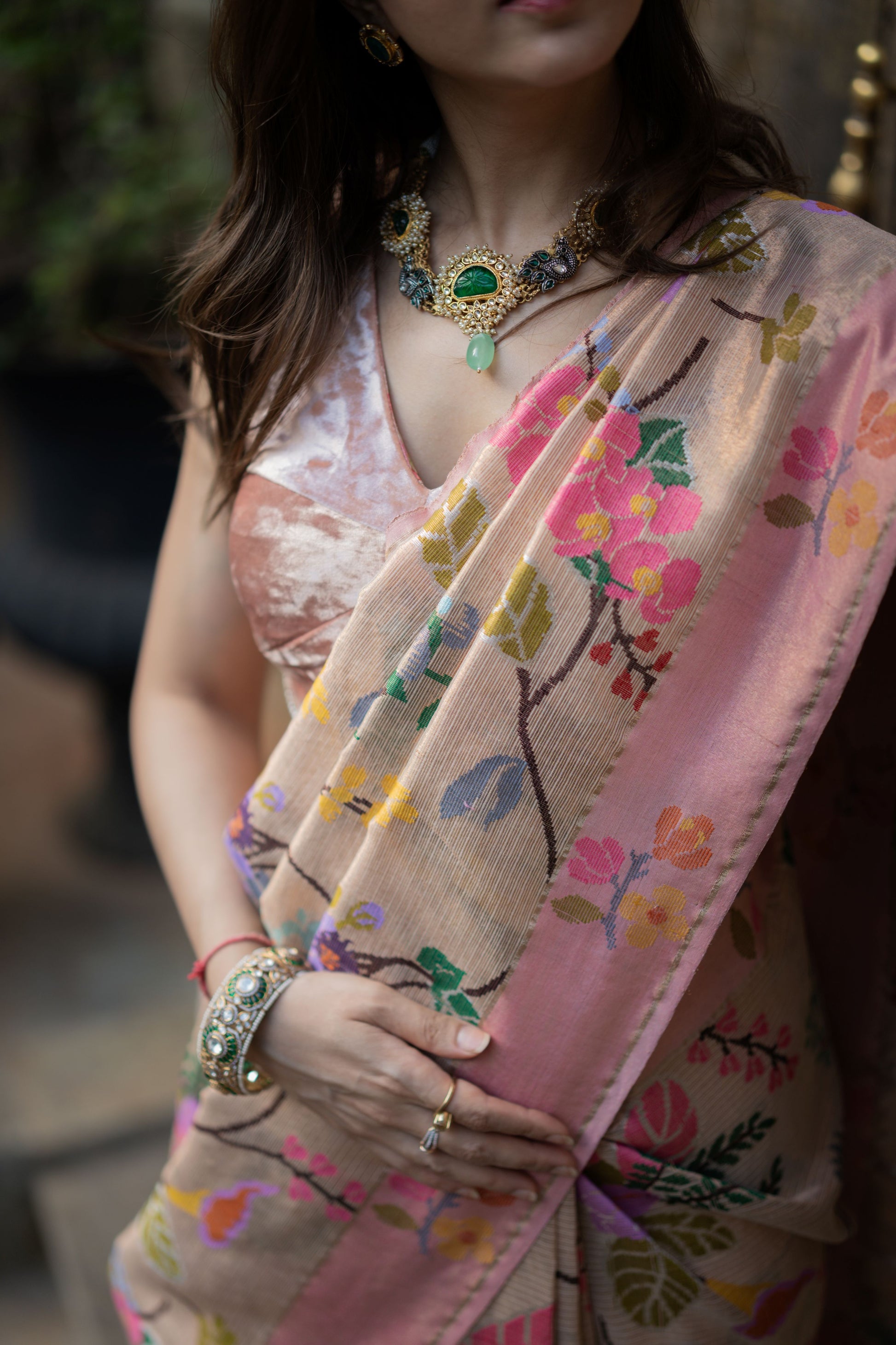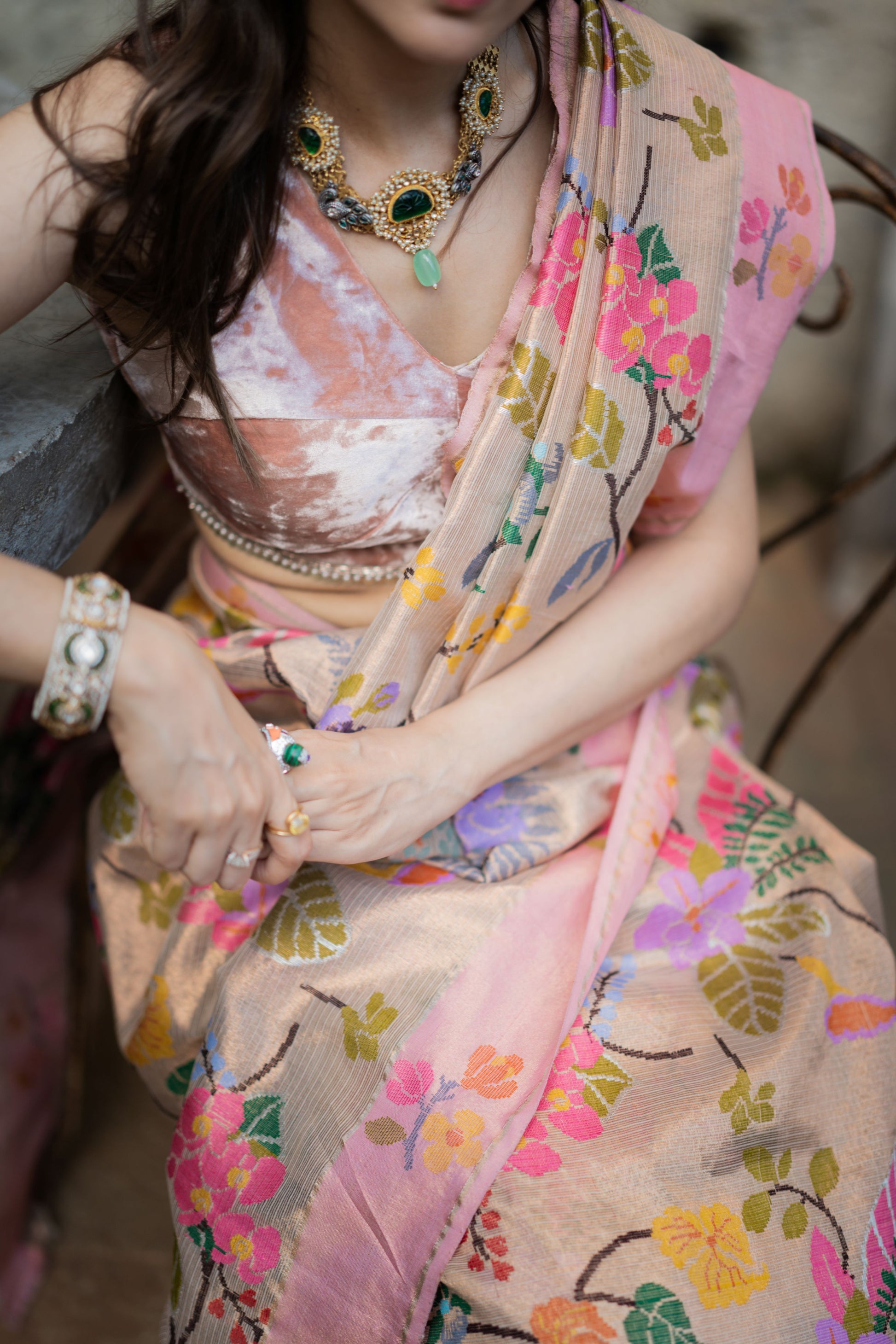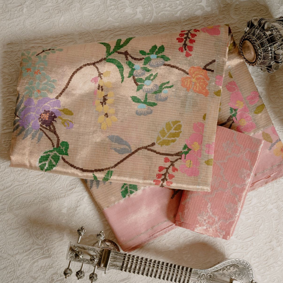 Experience the epitome of elegance with our Gold Real Zari Tissue Kota Saree, adorned with a traditional Paithani border. Handwoven to perfection, this exquisite piece combines the light, airy texture of Tissue Kota with the luxurious gleam of Gold Real Zari threads, creating a stunning balance of sophistication and timeless beauty.