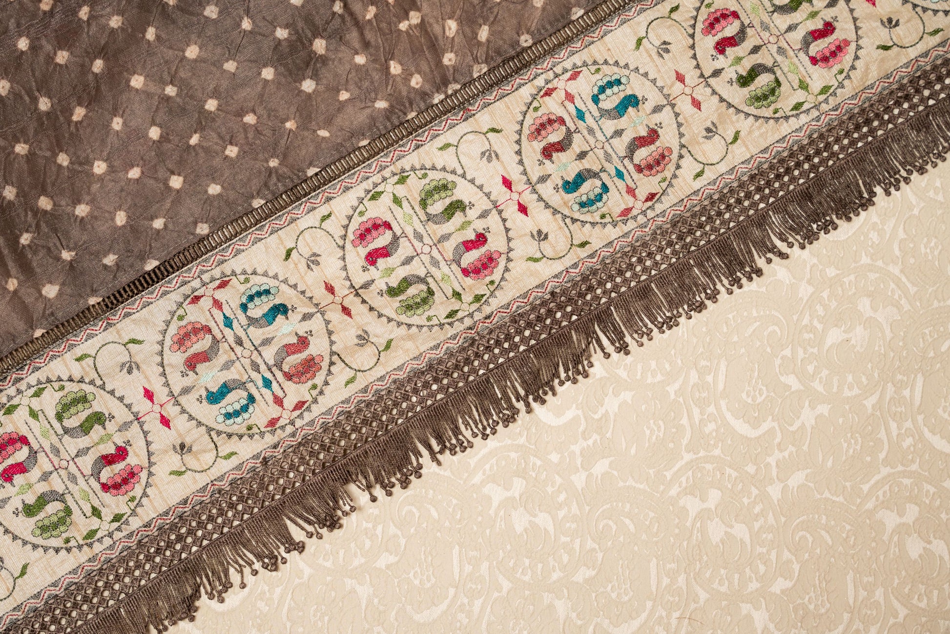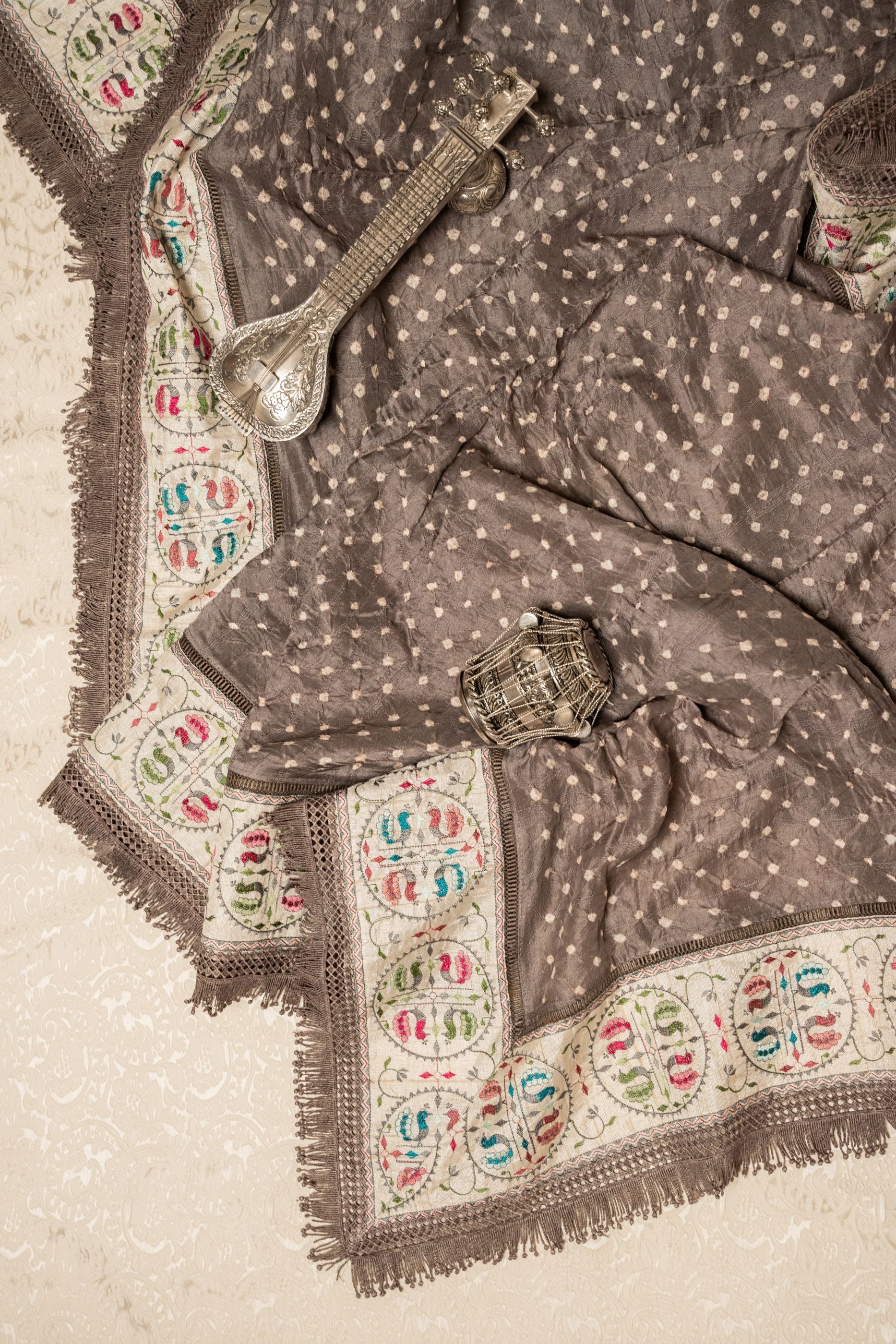 Rooted in craft, elevated in elegance—this grey Bandhani saree is a seamless blend of two iconic Indian art forms. Hand-tied Bandhani dots grace the body of the saree with rhythmic precision, while a stunning Parsi Gara embroidered border frames it with intricate floral storytelling.