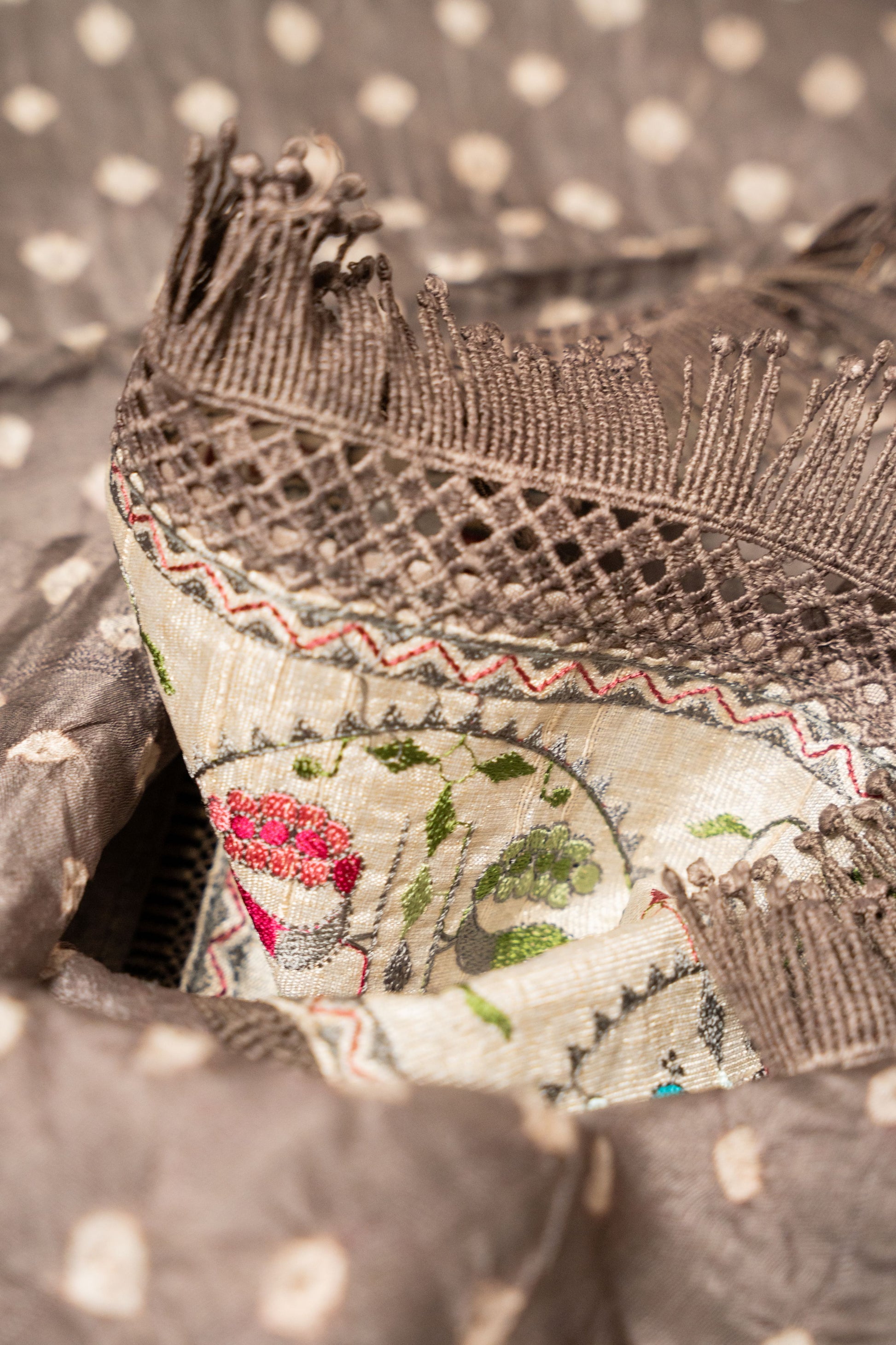 The neutral grey base offers a contemporary canvas, letting the detailed embroidery shine in all its heirloom glory. The contrast of texture and craft makes this saree a conversation starter—subtle yet statement-making.