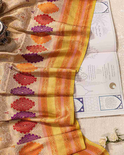 A soft silk handwoven Banarasi brocade saree in graceful shades of ecru and gold, adorned with vibrant highlights of orange, pink, and purple.