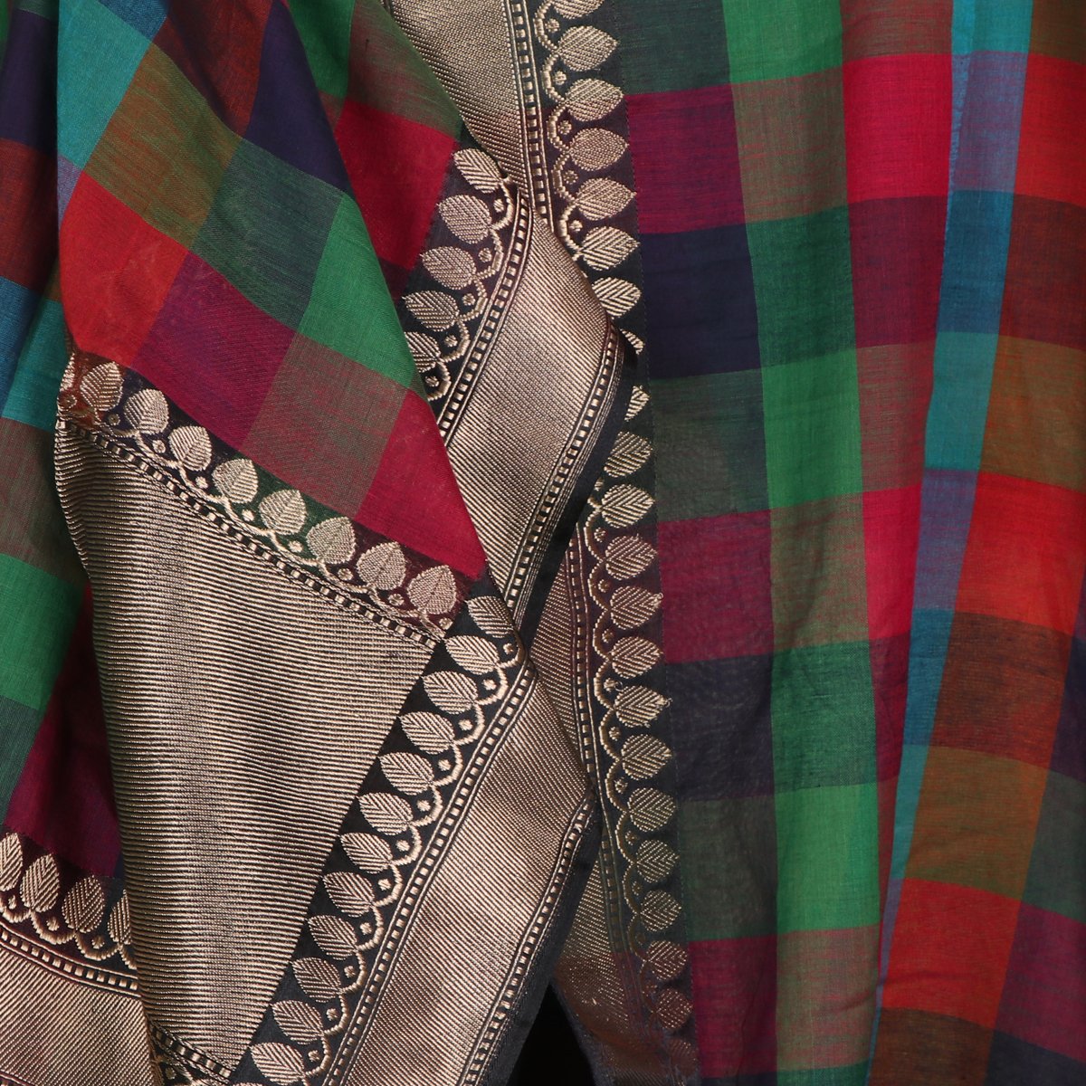 This Handwoven multicoloured Banarasi dupatta features a beautiful twill gold border with a contemporary rudraksha motif. The broad colourful checks along with broad gold borders make it a statement yet elegant piece of our collection.