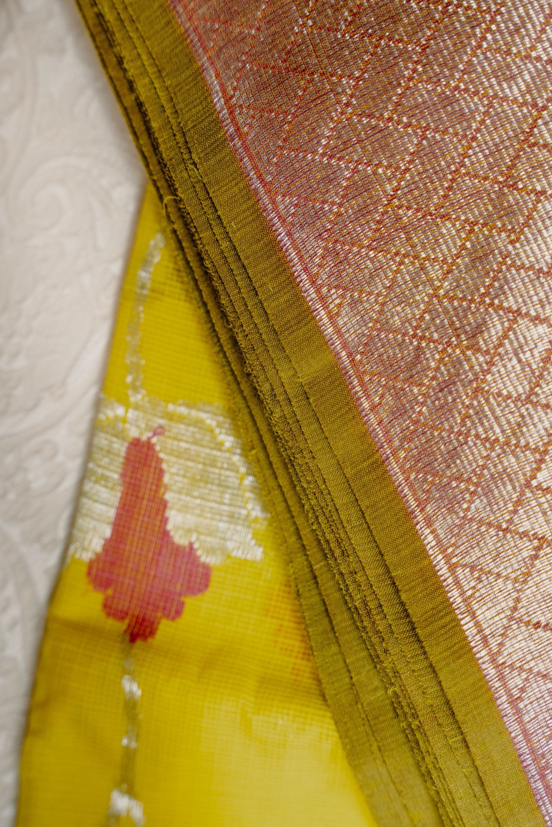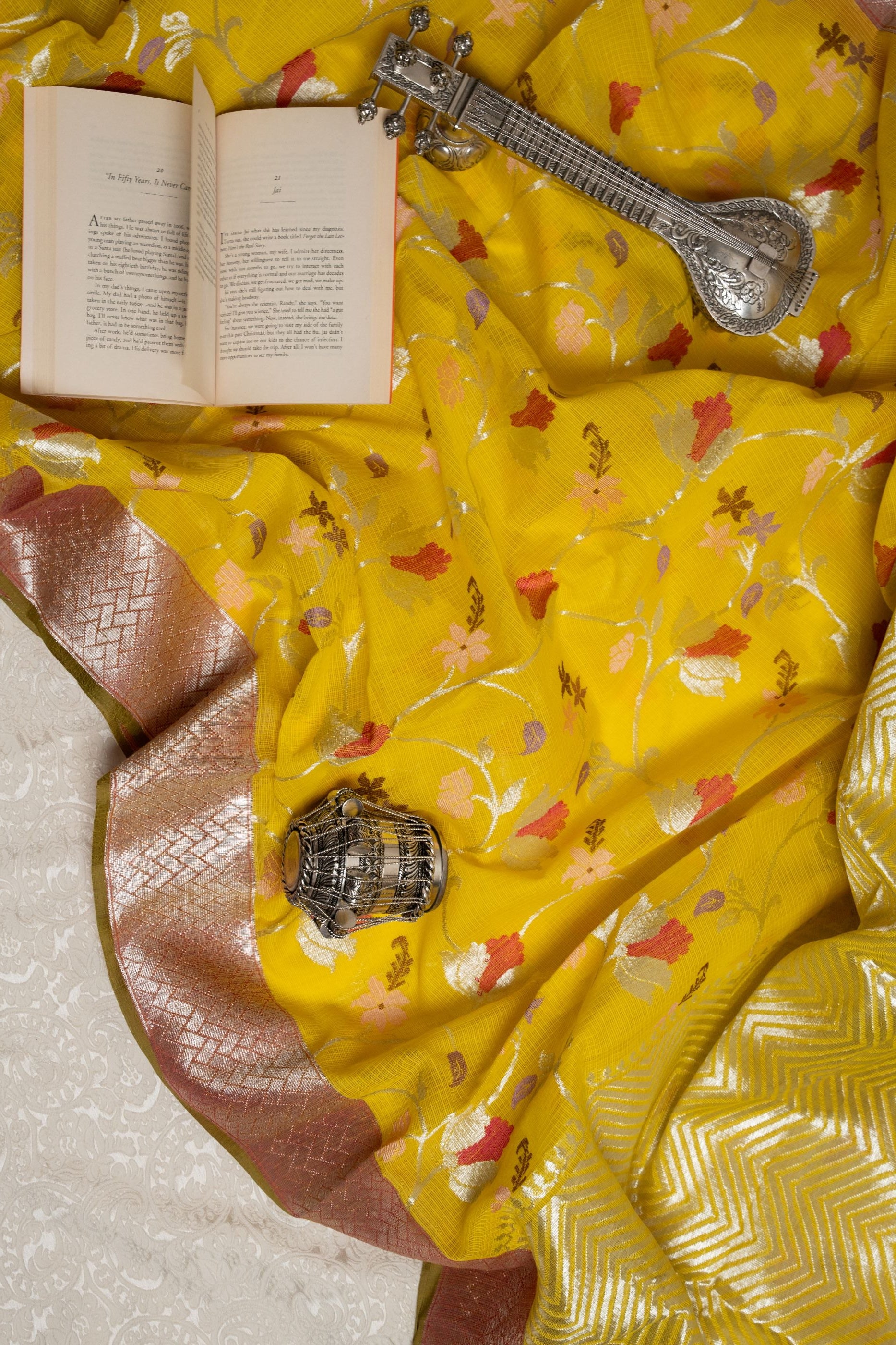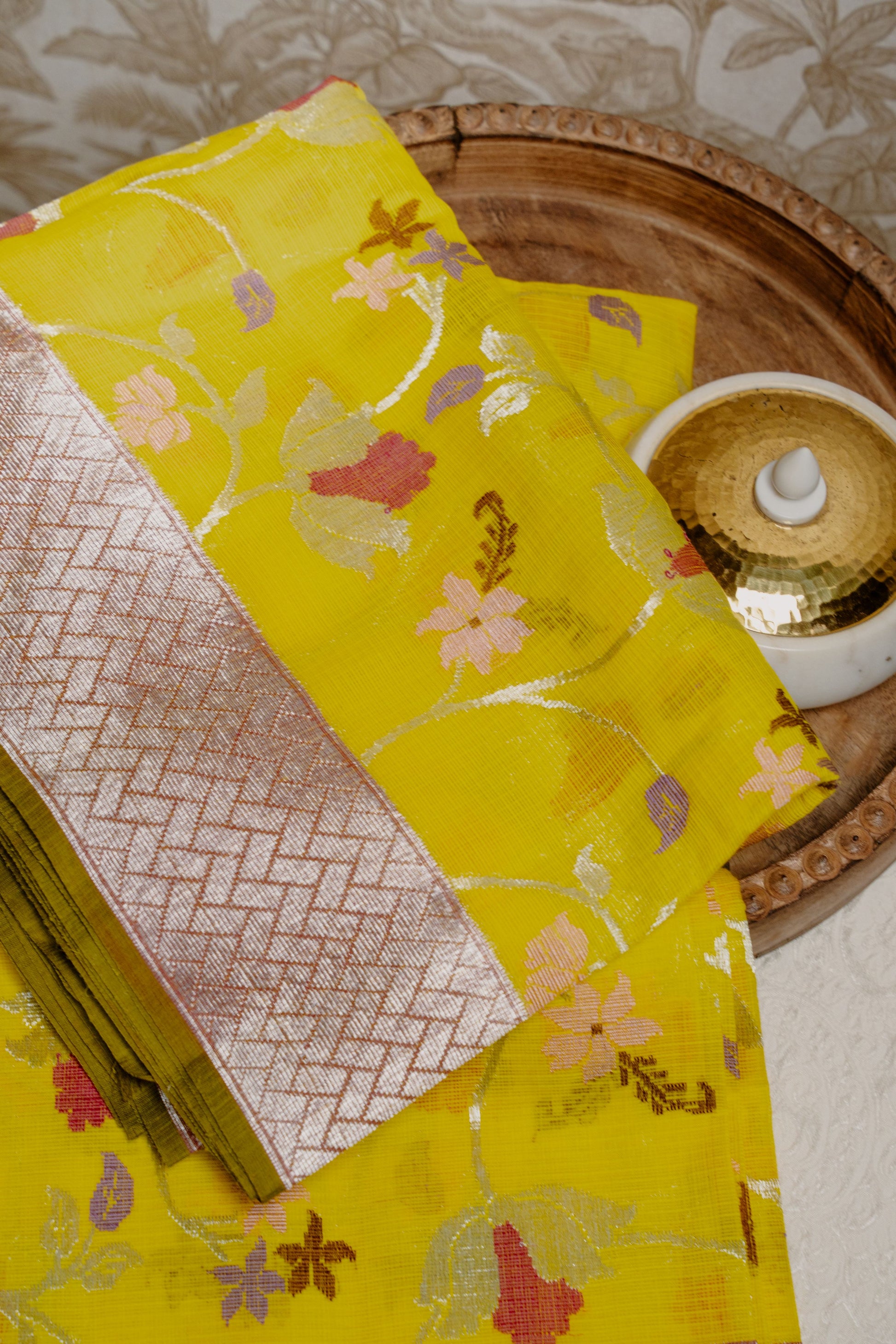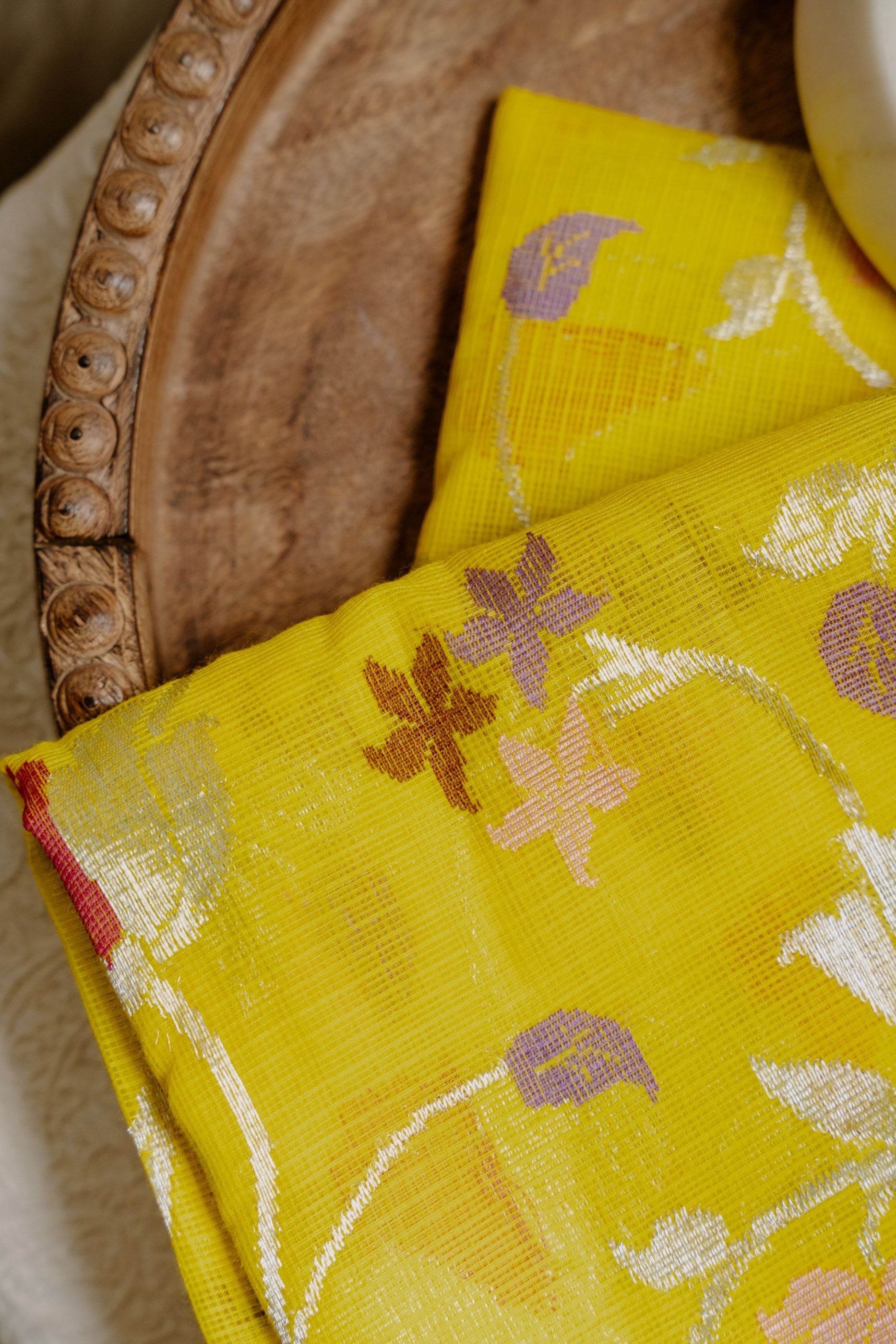 This lemon yellow Kota saree glows with understated luxury, featuring fine real zari woven through a sheer, breathable Kota base. The saree is adorned with an all-over floral jamal pattern — delicate, intricate, and endlessly graceful.
