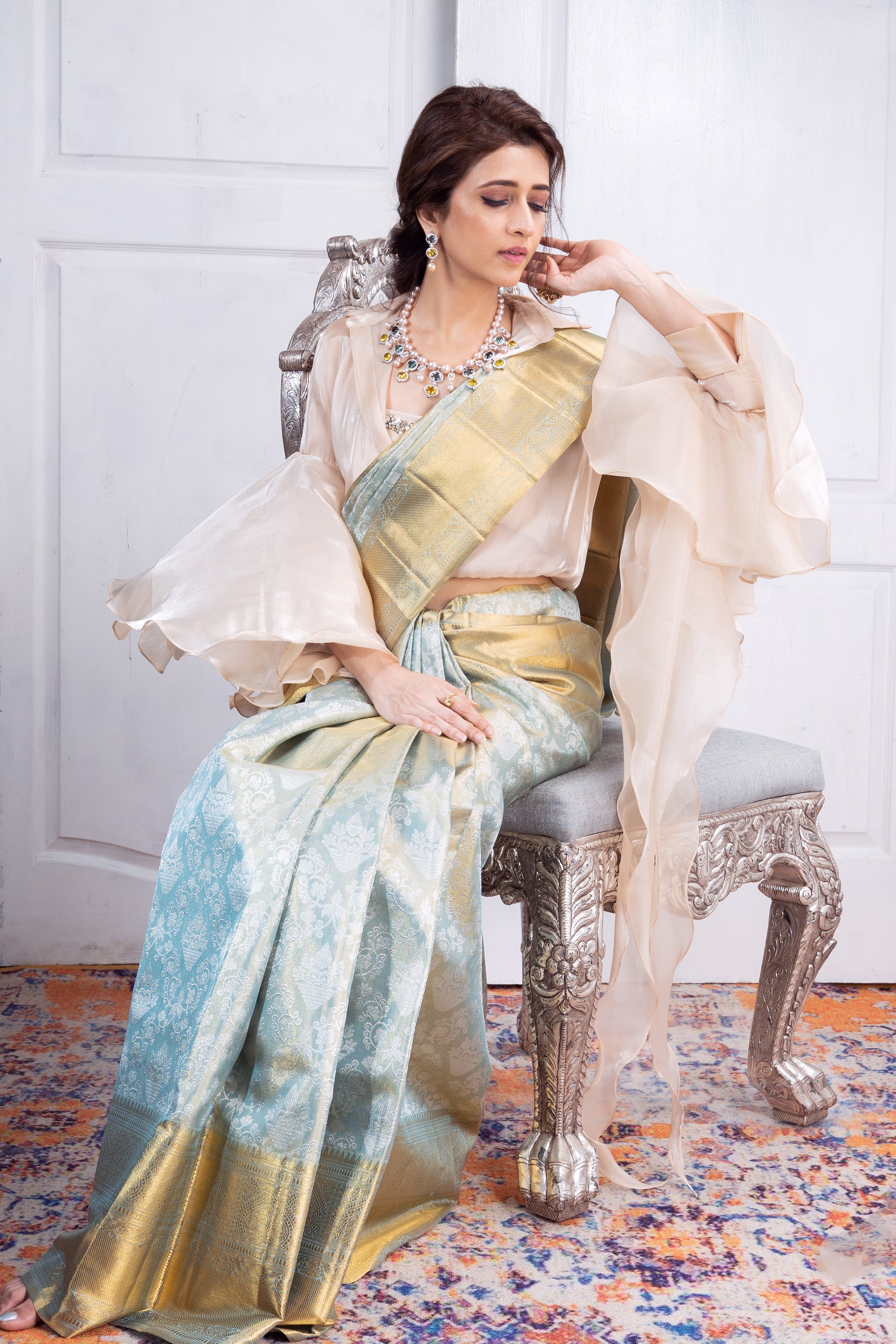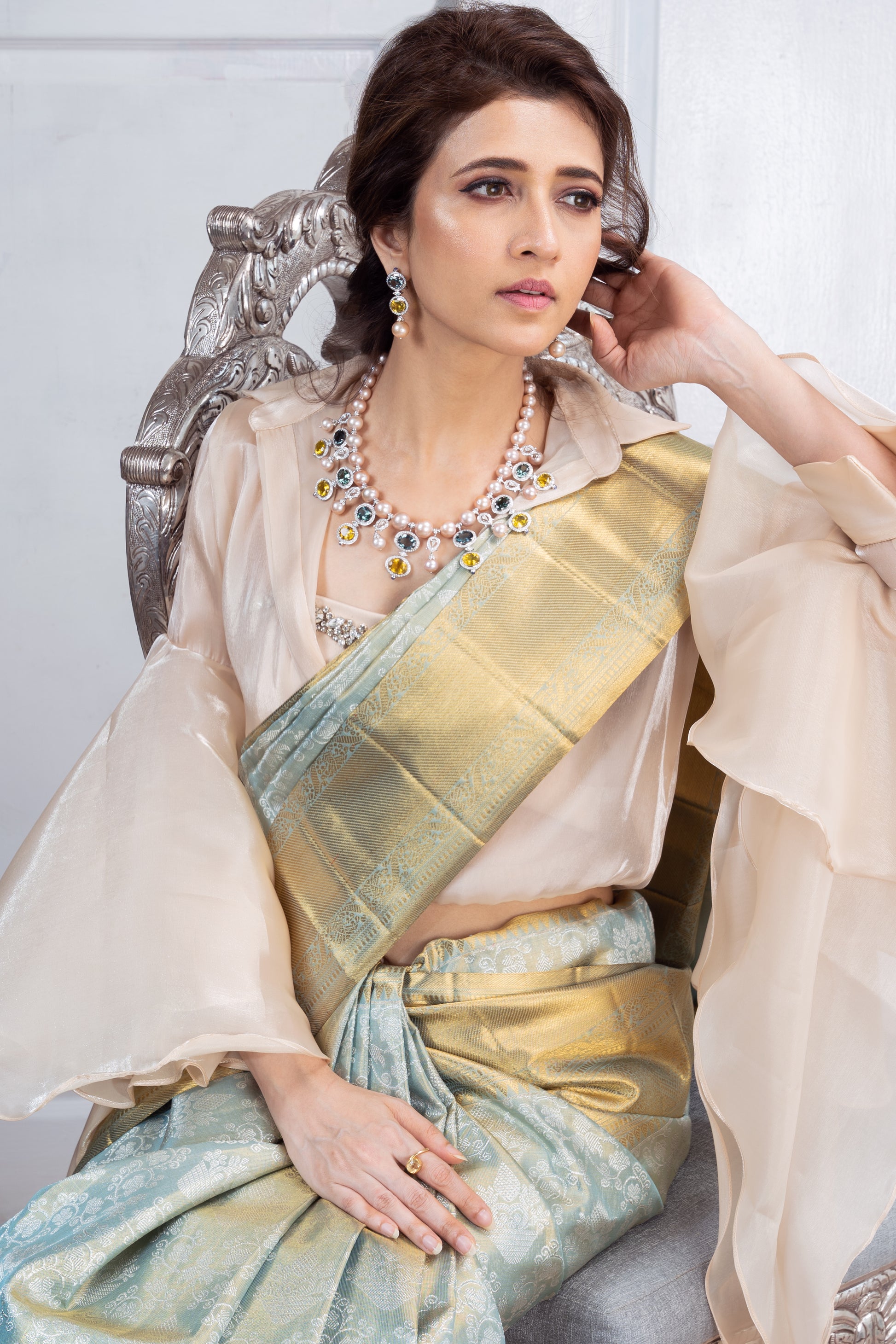 The ocean green Kanjeevaram silk saree carries this iconic weave with elegance. The green silk tissue embellished with gold zari brocades tucked into a self border flourished in peacocks and floral vines makes the saree a symbol of ethereal beauty.This saree features intricate floral zari that exudes elegance and a timeless charm.