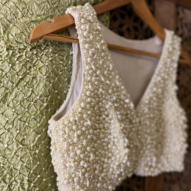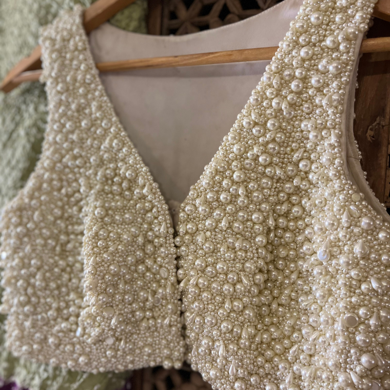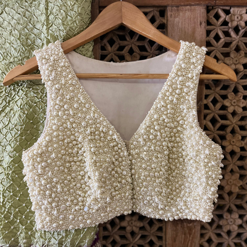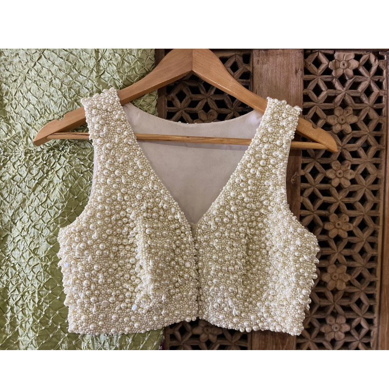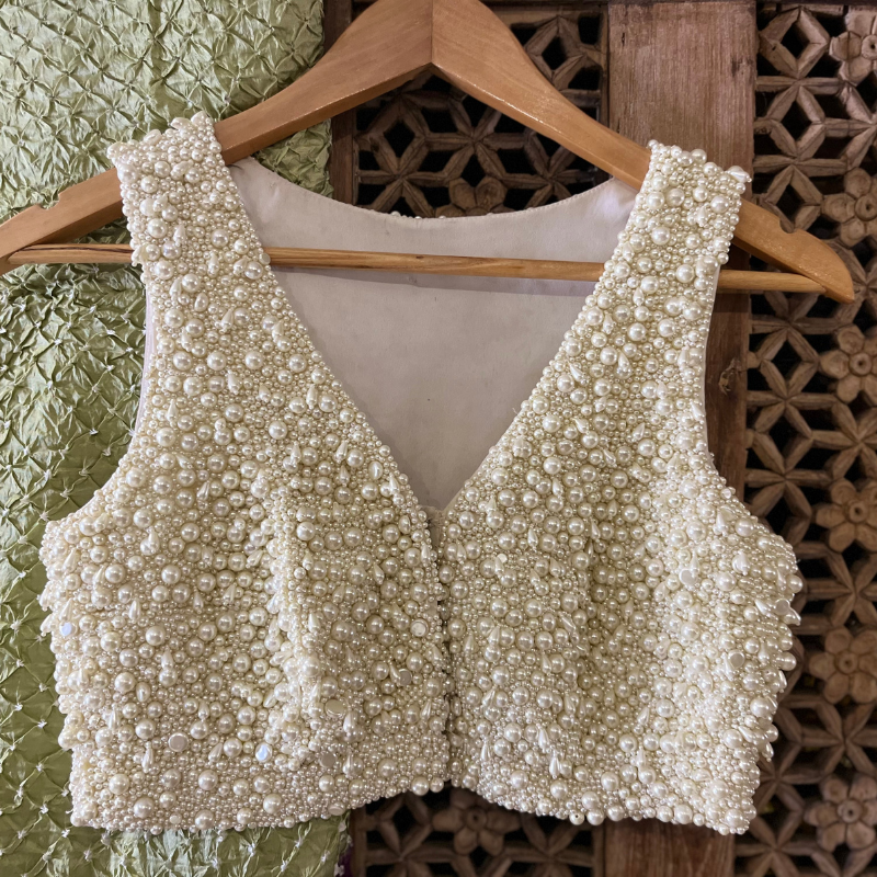 Add a touch of elegance to your wardrobe with our White Pearl Blouse. This blouse features beautiful pearl work that gives it a timeless charm, perfect for elevating your favorite saree.