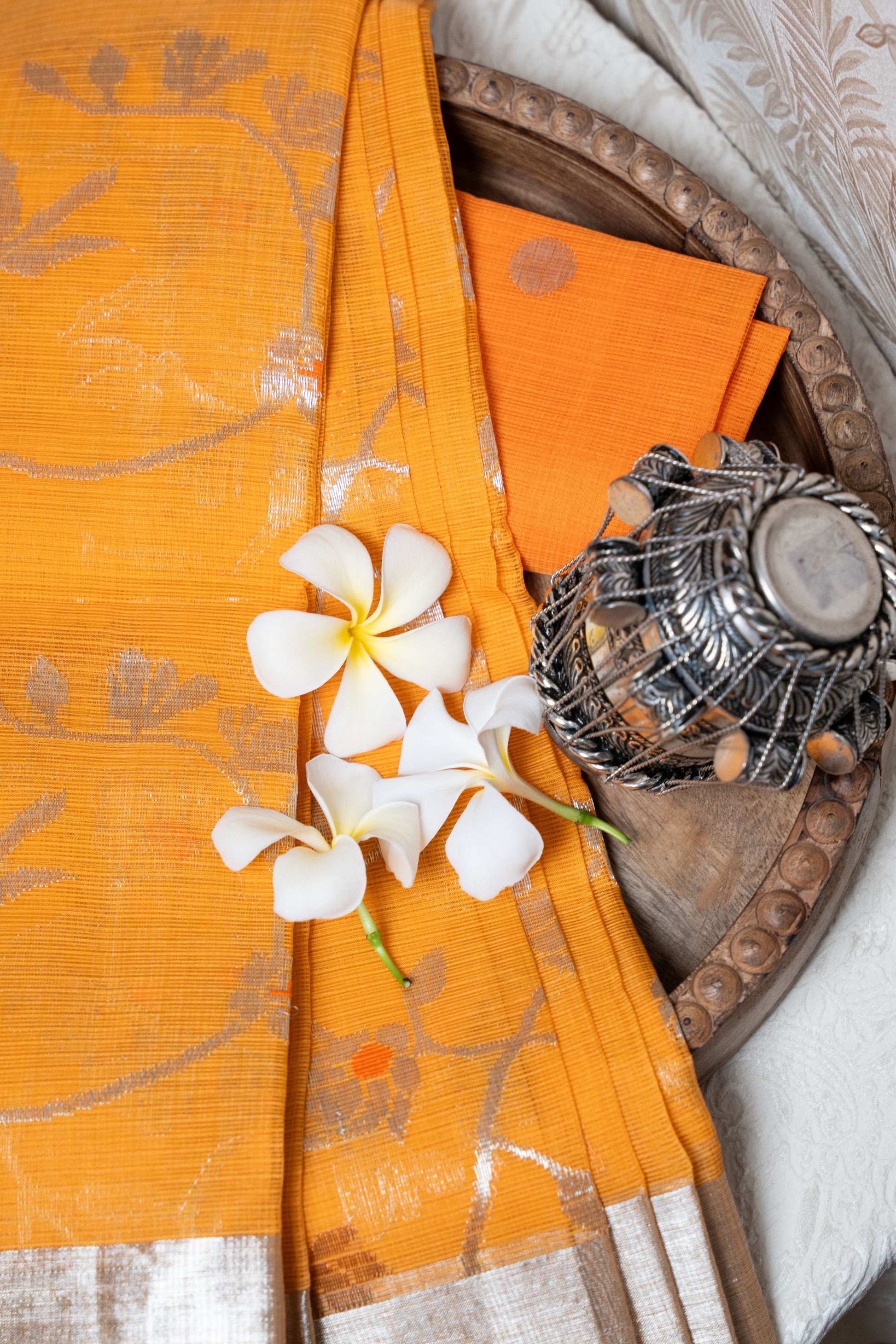 This vibrant orange Kota saree brings together the airy lightness of pure Kota weave and the timeless charm of handwoven butti motifs. Each butti is delicately placed, adding texture and grace without overpowering the natural translucence of the fabric.