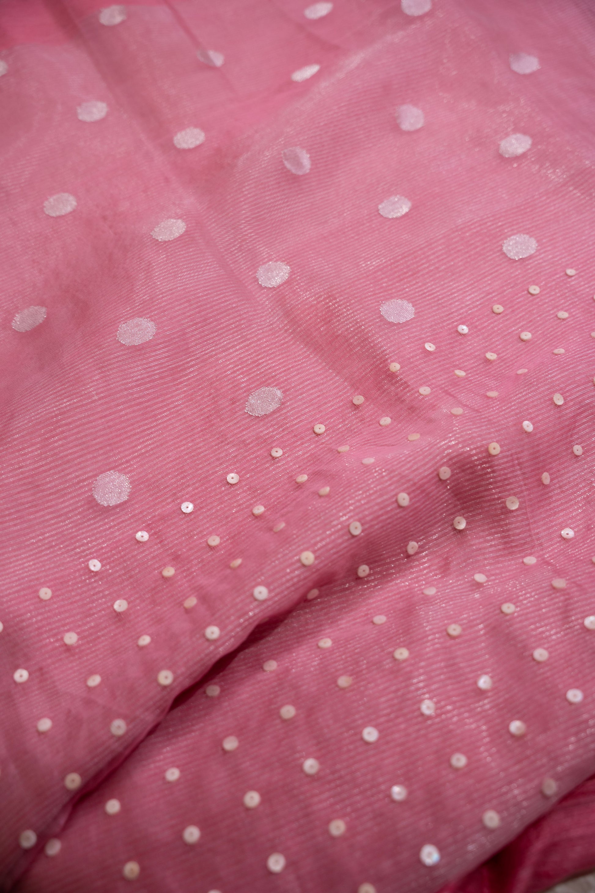 The sheer organza segment is delicately hand-embellished with shell details—each piece thoughtfully placed to reflect light and movement like ripples on water. Lightweight, breezy, and refreshingly unique, this saree blurs the lines between traditional craft and contemporary elegance.