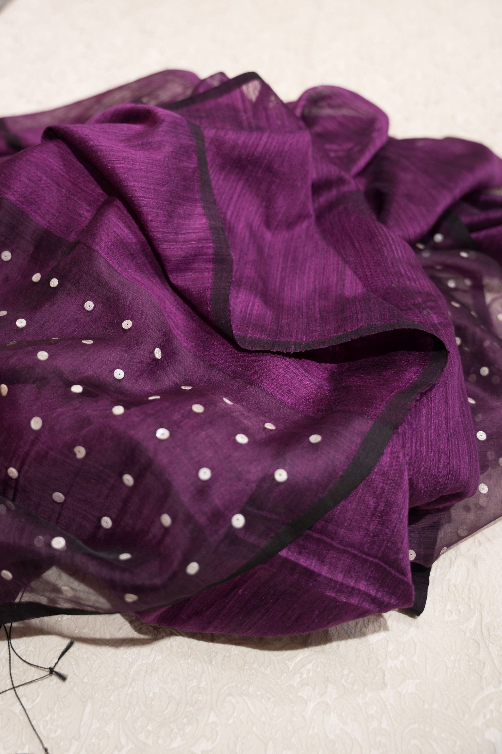 The sheer organza segment is delicately hand-embellished with shell details—each piece thoughtfully placed to reflect light and movement like ripples on water. Lightweight, breezy, and refreshingly unique, this saree blurs the lines between traditional craft and contemporary elegance.