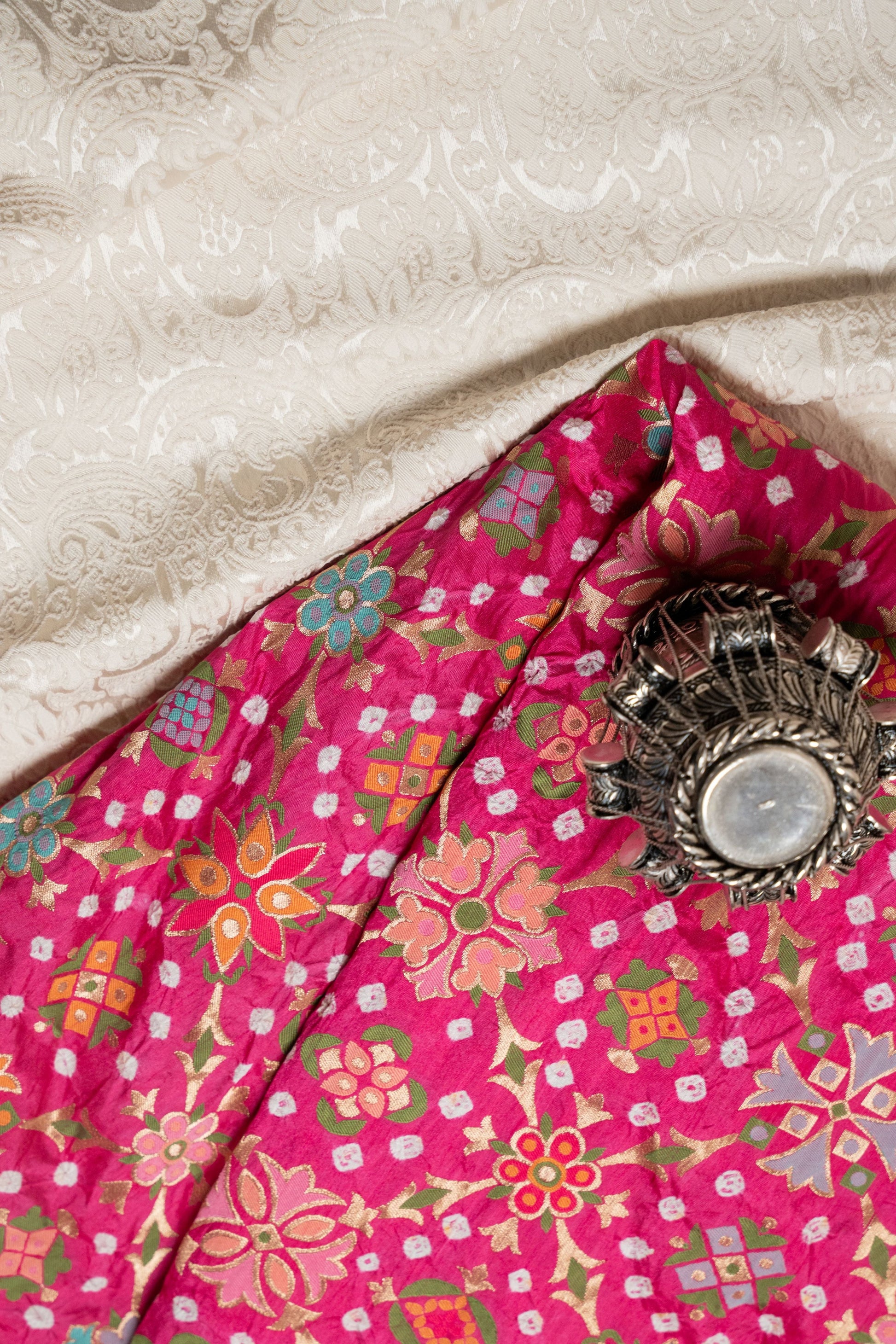 A masterpiece of heritage, color, and craftsmanship — this pink Gadwal silk saree is where three timeless traditions meet: the finesse of Gadwal weaving, the intricate Patola motif play, and the soul of Bandhini tie-dye.