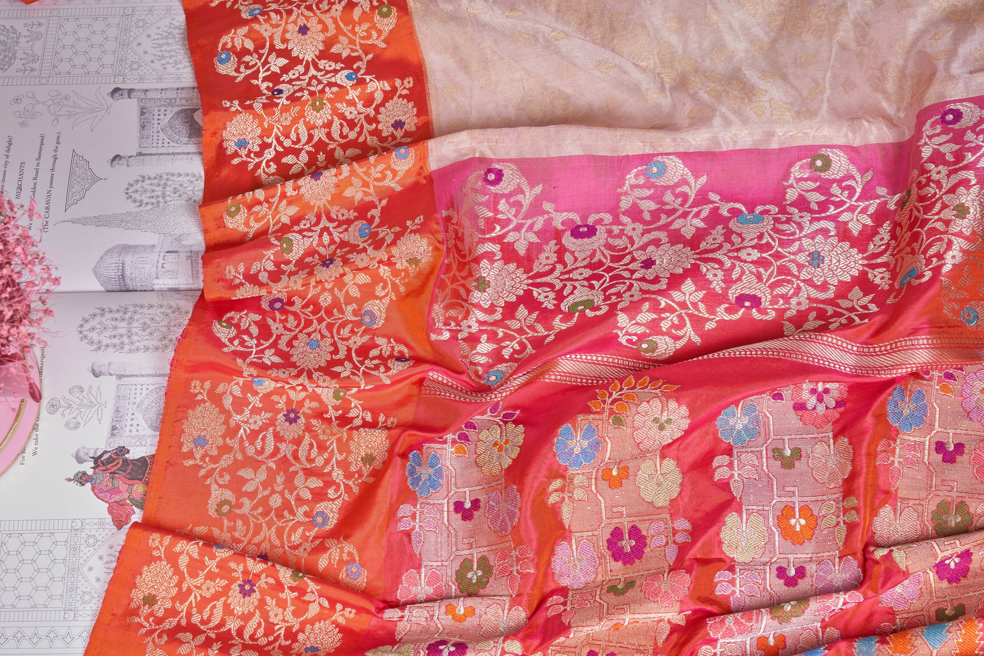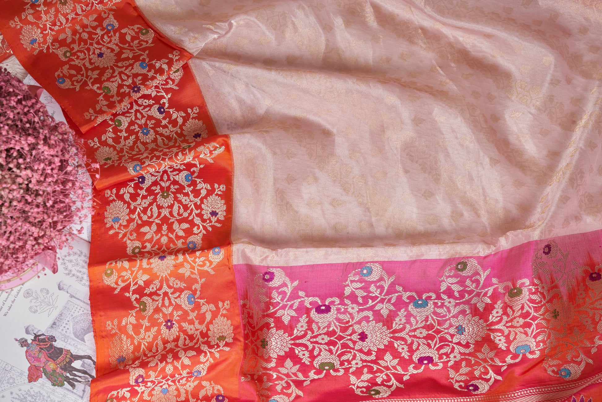 Elevate your ethnic ensemble with our exquisite Powder Pink Banarasi Silk Saree, adorned with a dual-tone border in shades of red and pink. The soft silk body features intricate diagonal floral vine motifs woven in dull gold. The border showcases elaborate floral motifs and leaf vines crafted in antique gold Zari, enhanced with meenakari work in shades of green, blue, and purple. This saree is perfect for weddings, cultural celebrations, and special occasions, all alike.