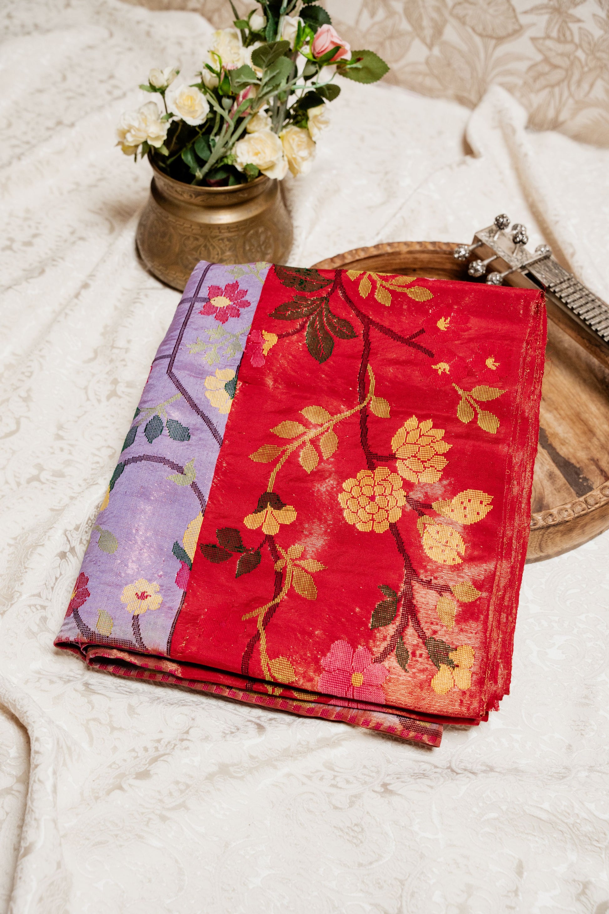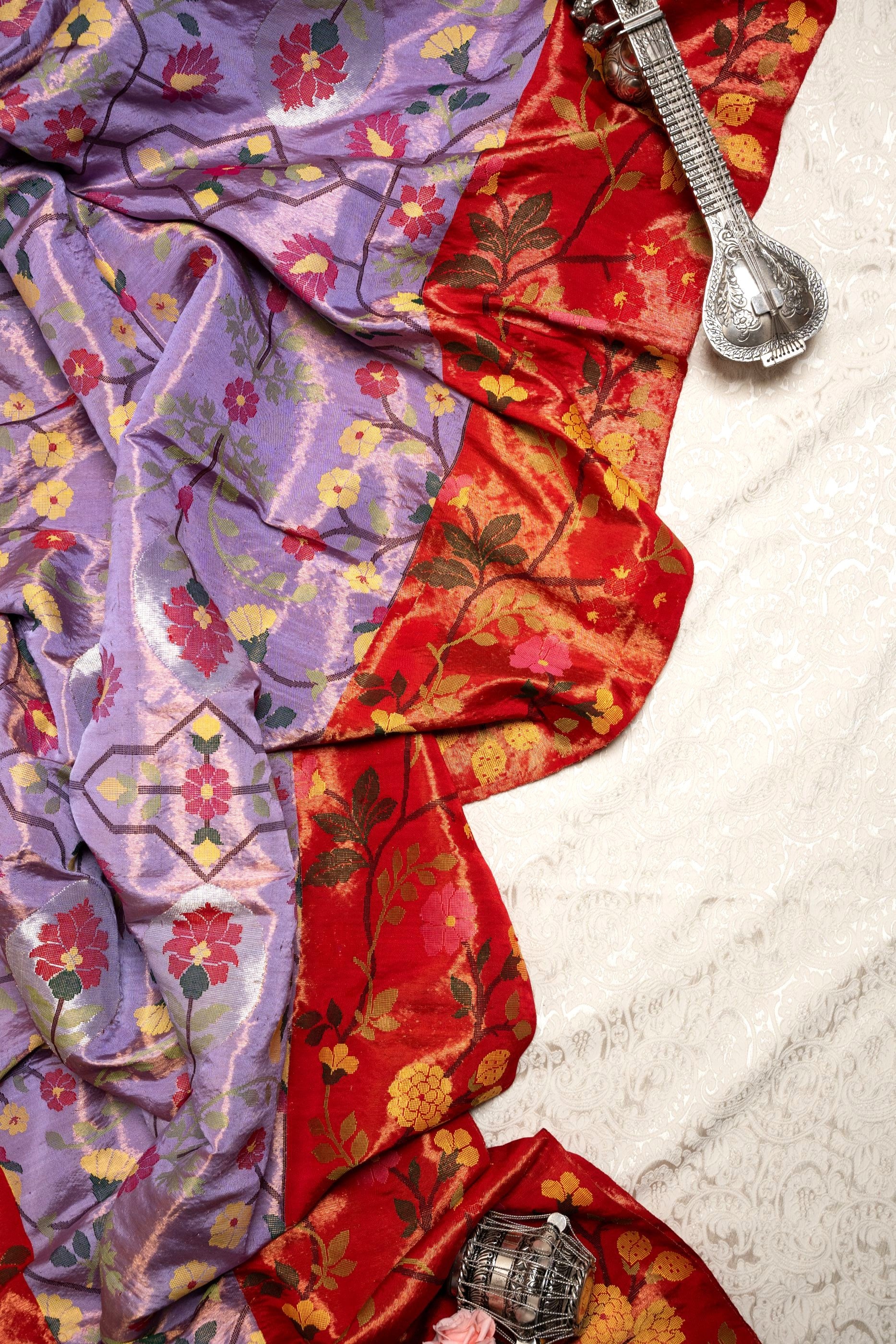 The vibrant red body anchors the look, while the lavender accents and ornate zari borders elevate it into heirloom territory. Light yet opulent, it’s perfect for weddings, festive rituals, and statement occasions that call for legacy dressing with a contemporary twist.