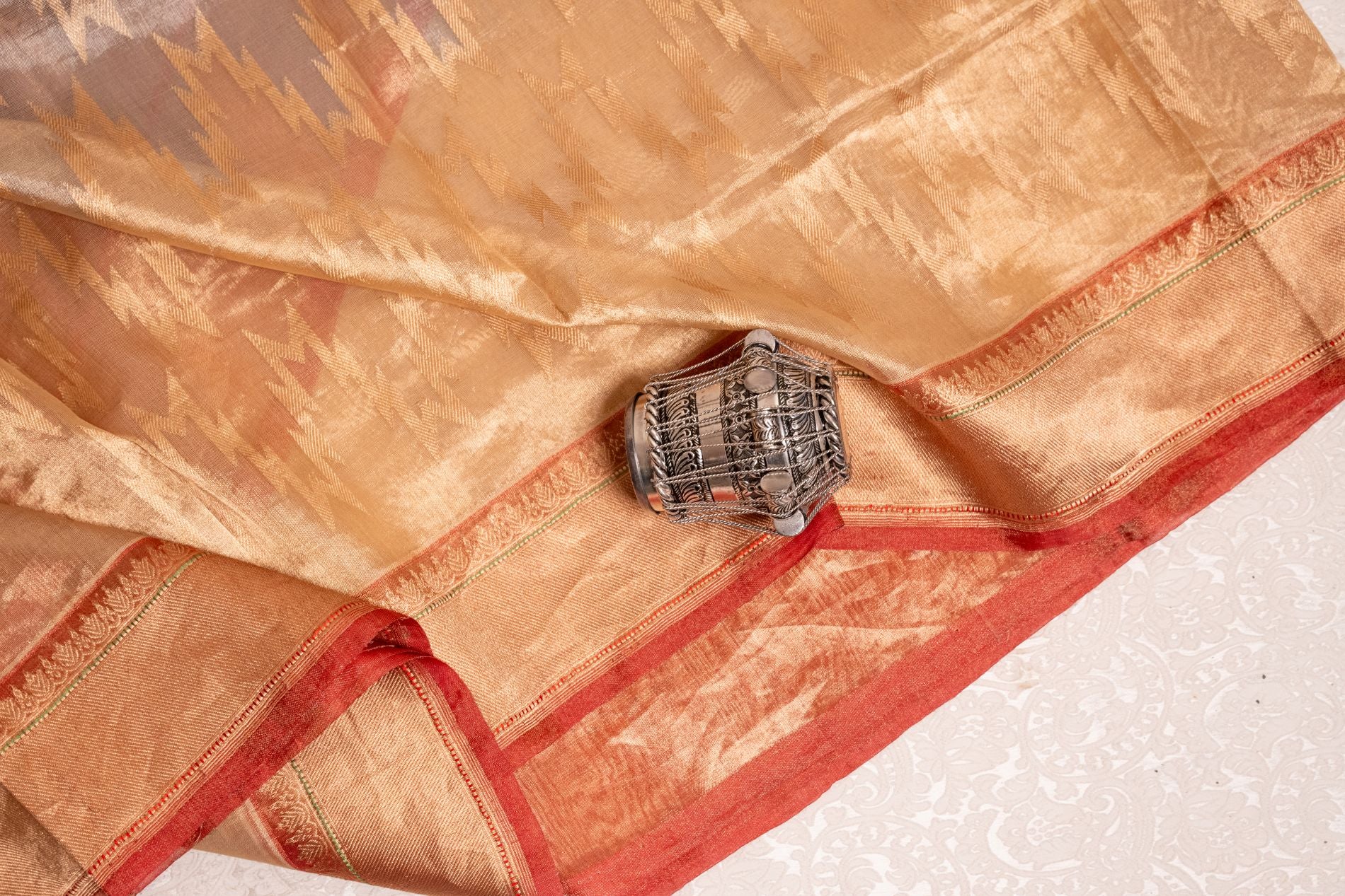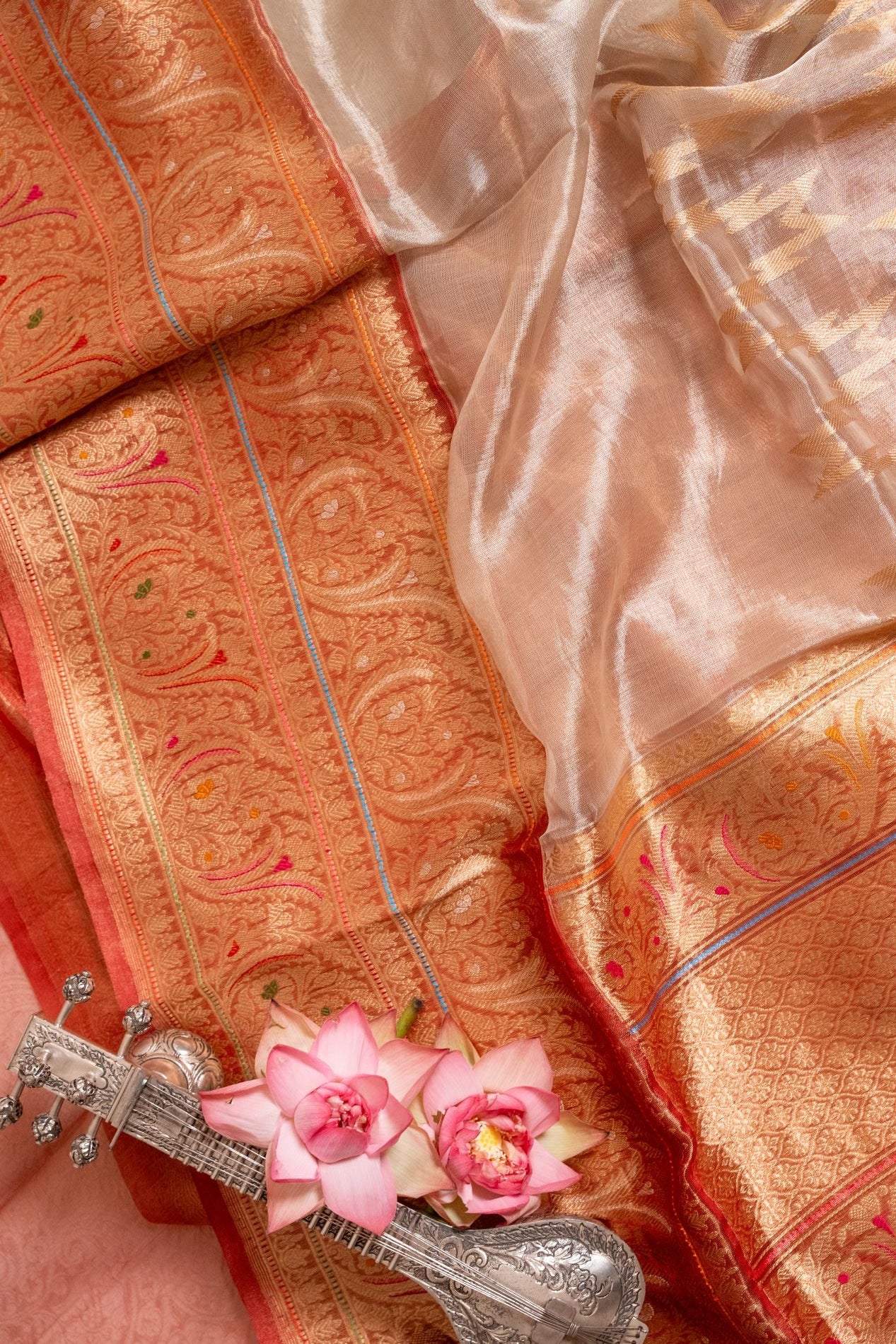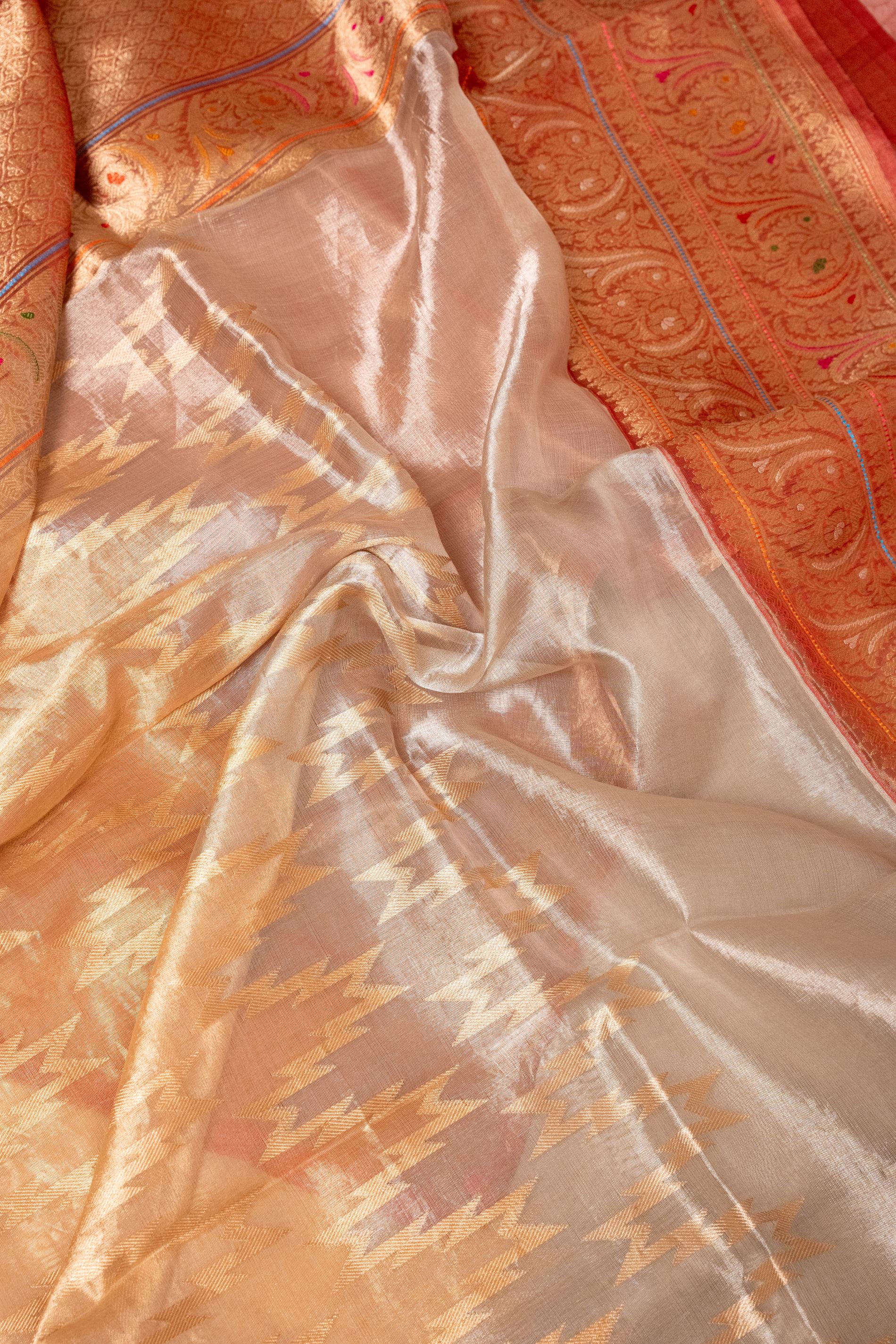 Silver and Gold Tissue Silk Saree with Rustic Orange Border