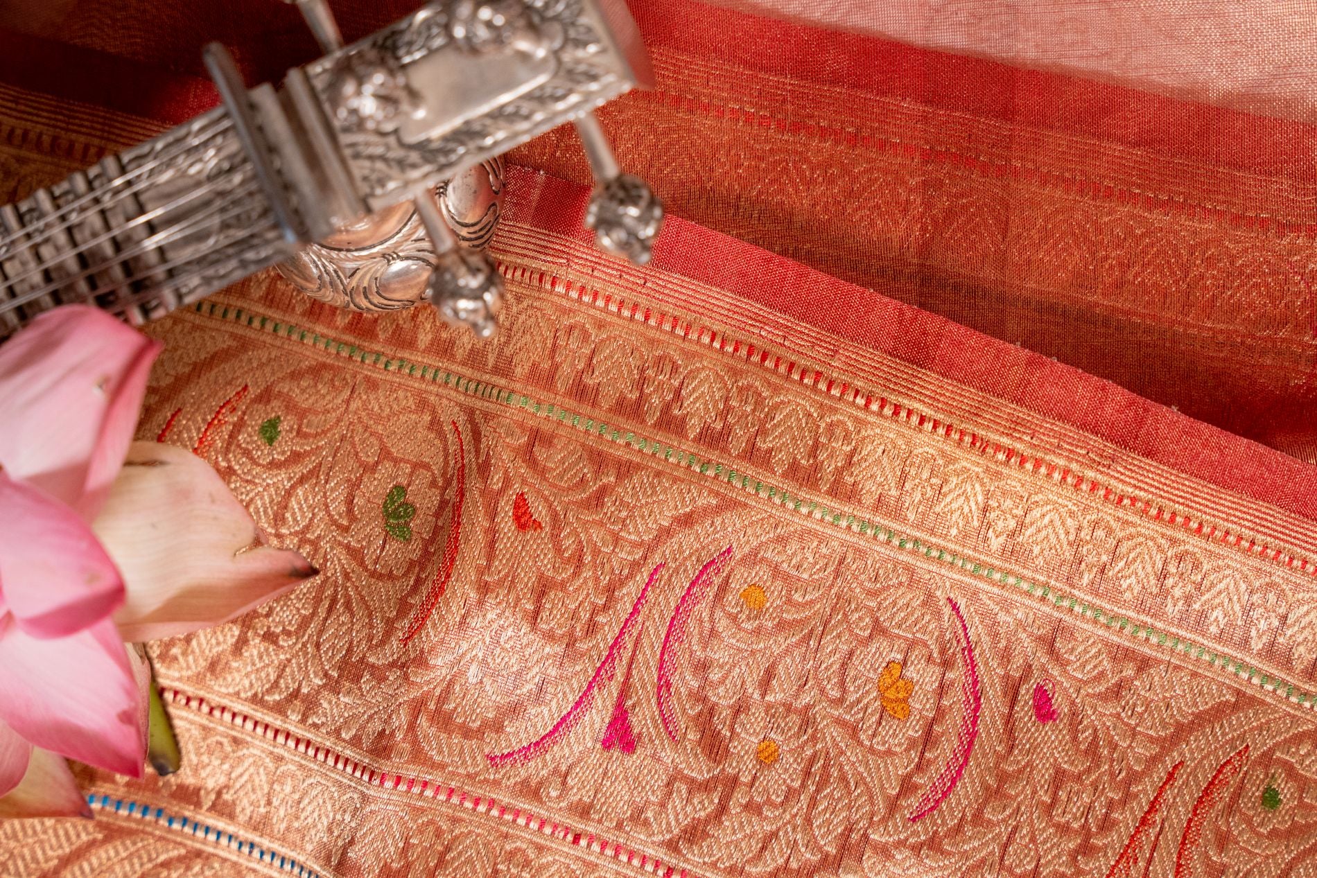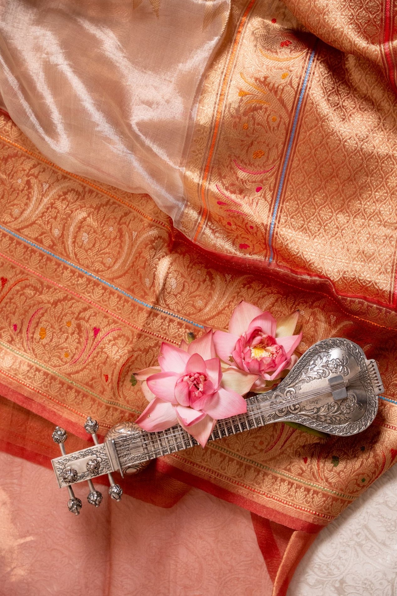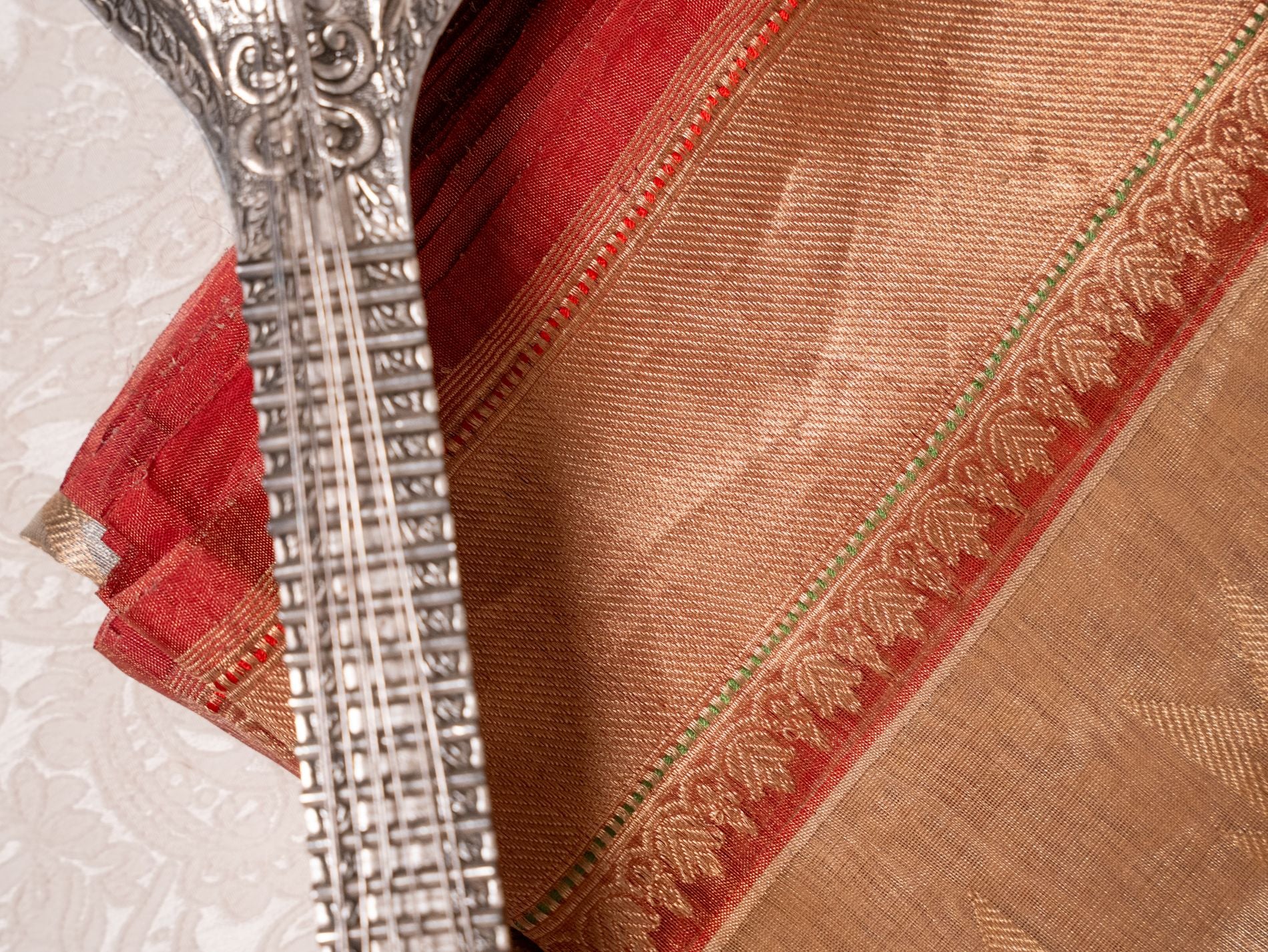 Silver and Gold Tissue Silk Saree with Rustic Orange Border