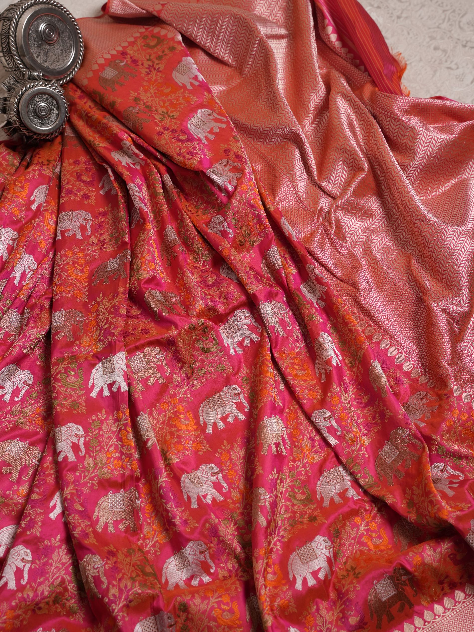 This Shikargha elephant pink banarasi silk saree features a stunning silver zari border and intricate detailing, perfect for adding a touch of elegance to any occasion. The fabric details provide a luxurious feel, while the wash care ensures long-lasting beauty. Elevate your style with this expertly crafted saree.