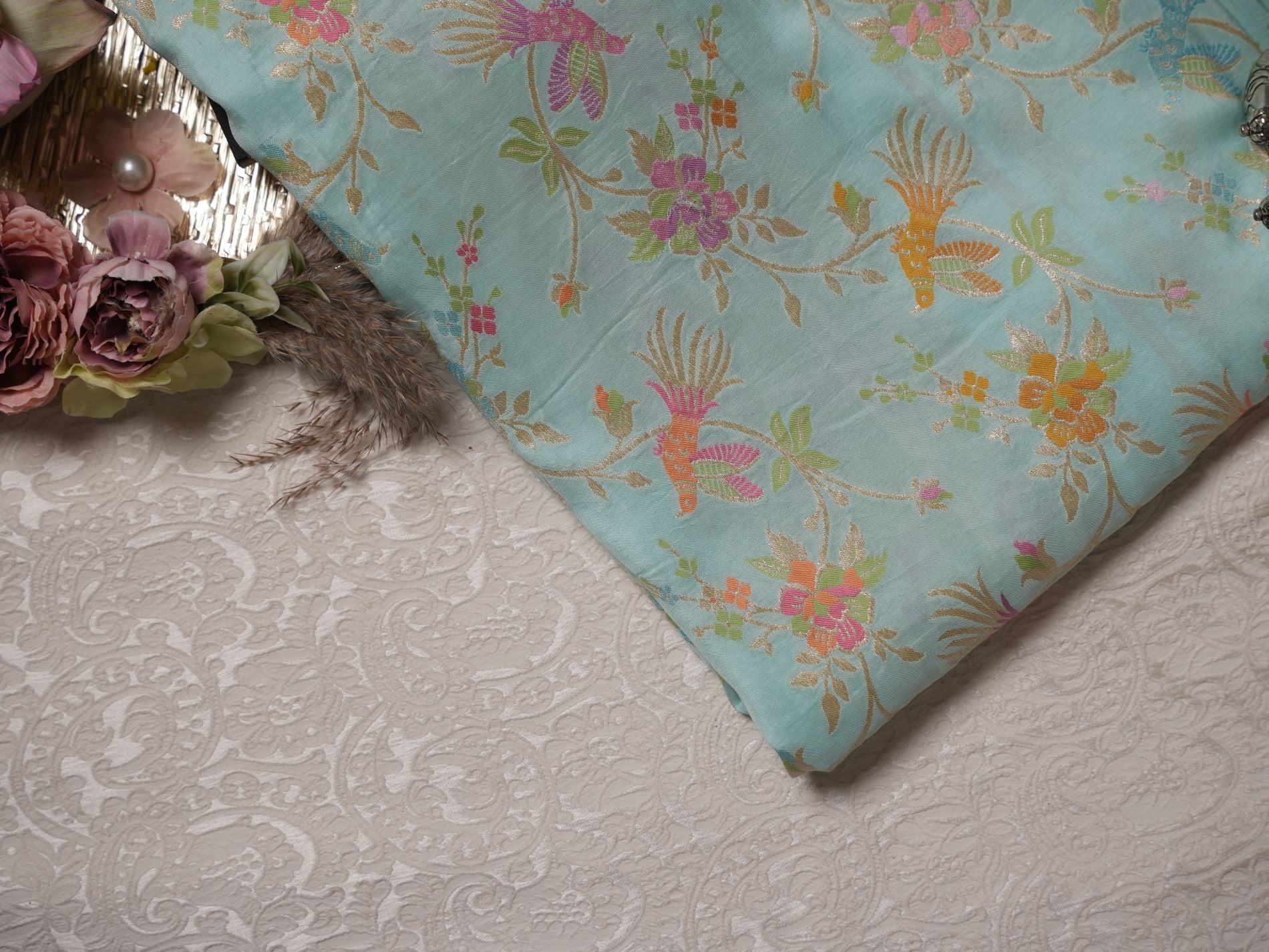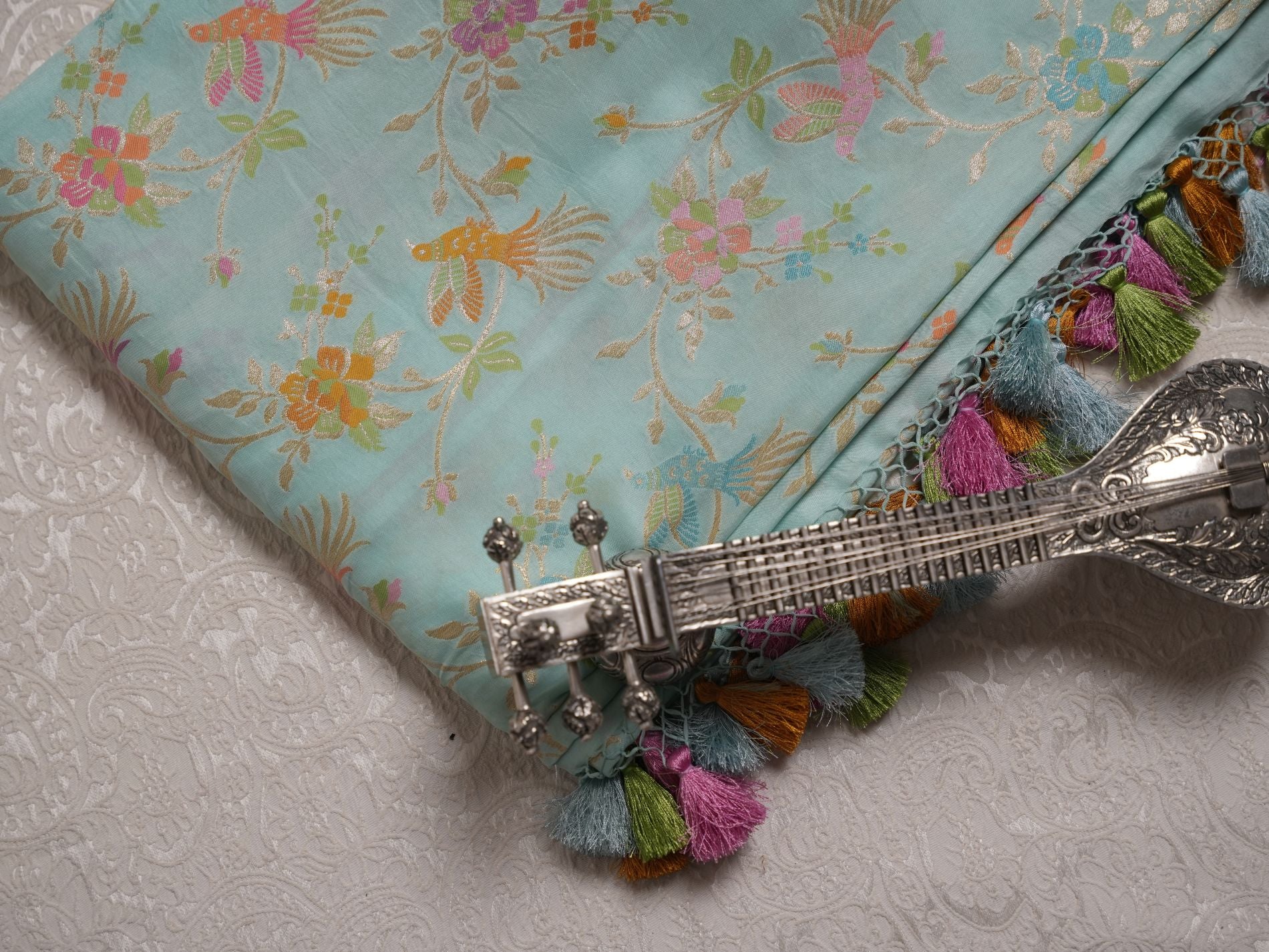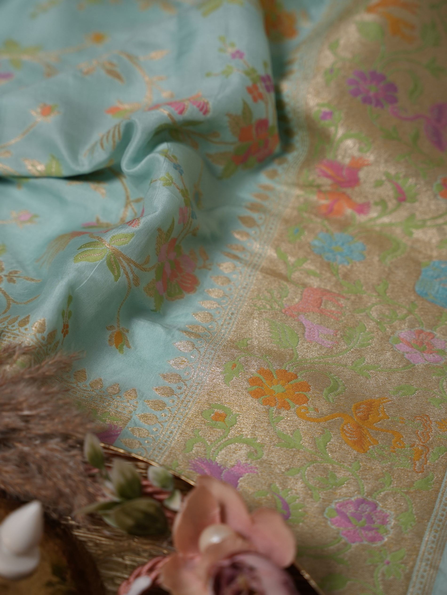 Color: Aqua blue with multicolour floral zari motifs and golden zari border