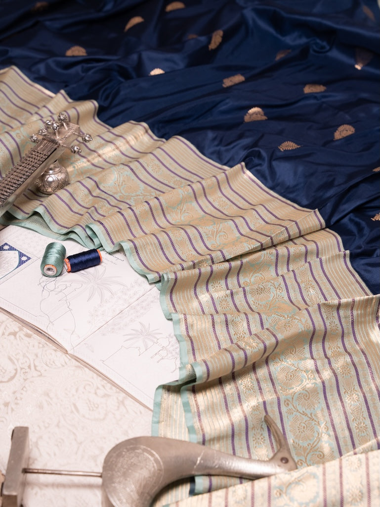 This Teal Blue Banarasi Silk Saree blends traditional weaving with soothing tones. The saree features a rich teal body, complemented by a subtle beige border that adds refined contrast. The Beige pallu with woven zari detailing gives the drape a fresh, airy finish—perfect for daytime functions, festive gatherings, and special celebrations.