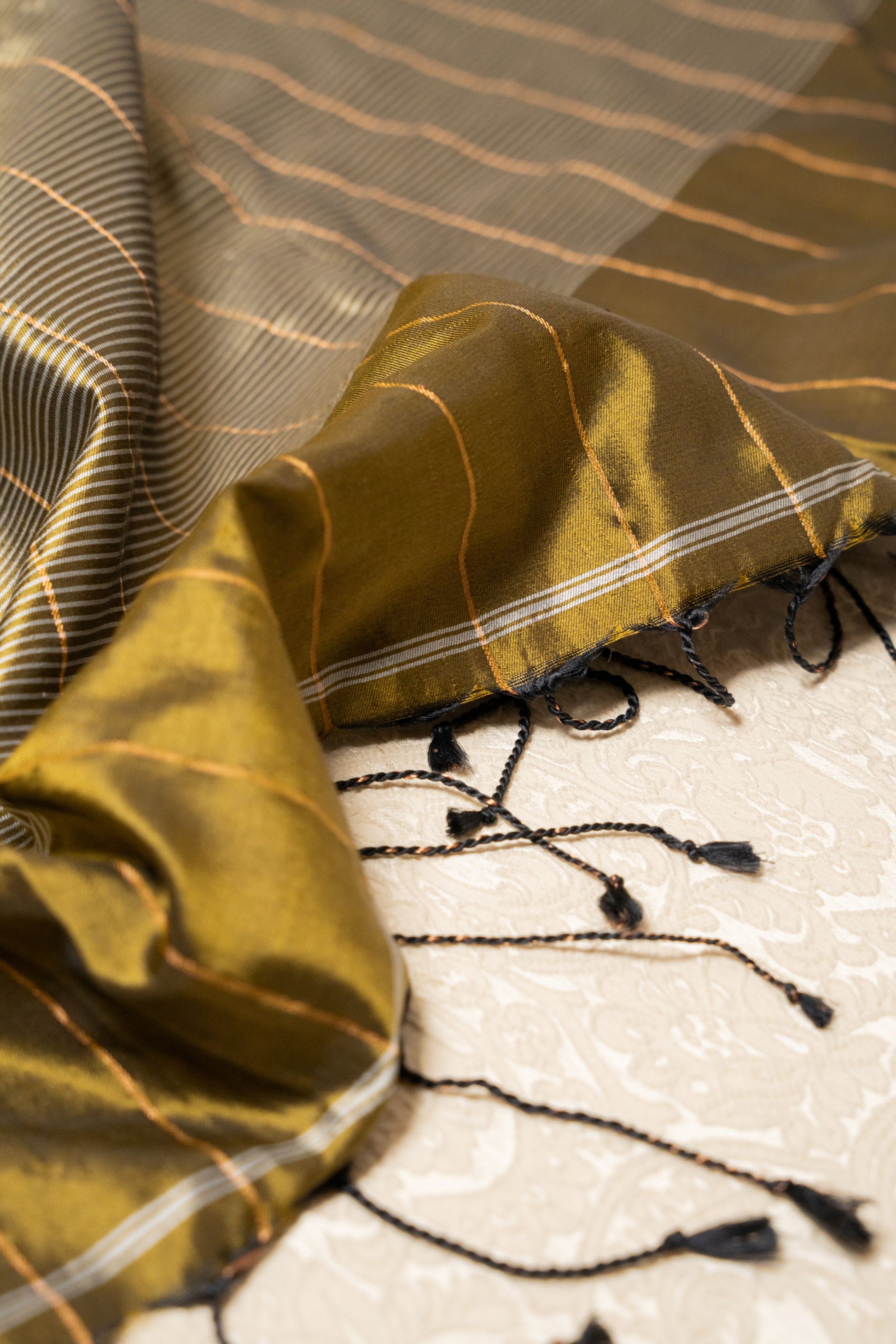 Verdant Stripes – Olive & Blue Soft Silk Saree