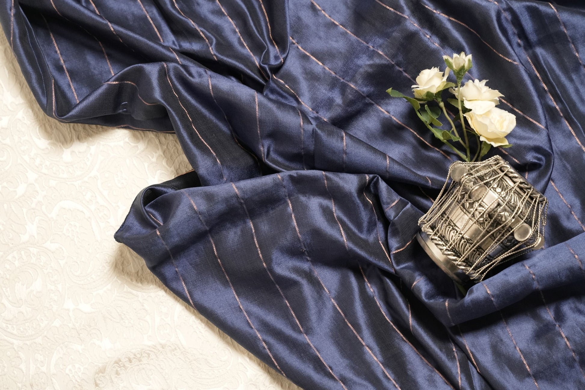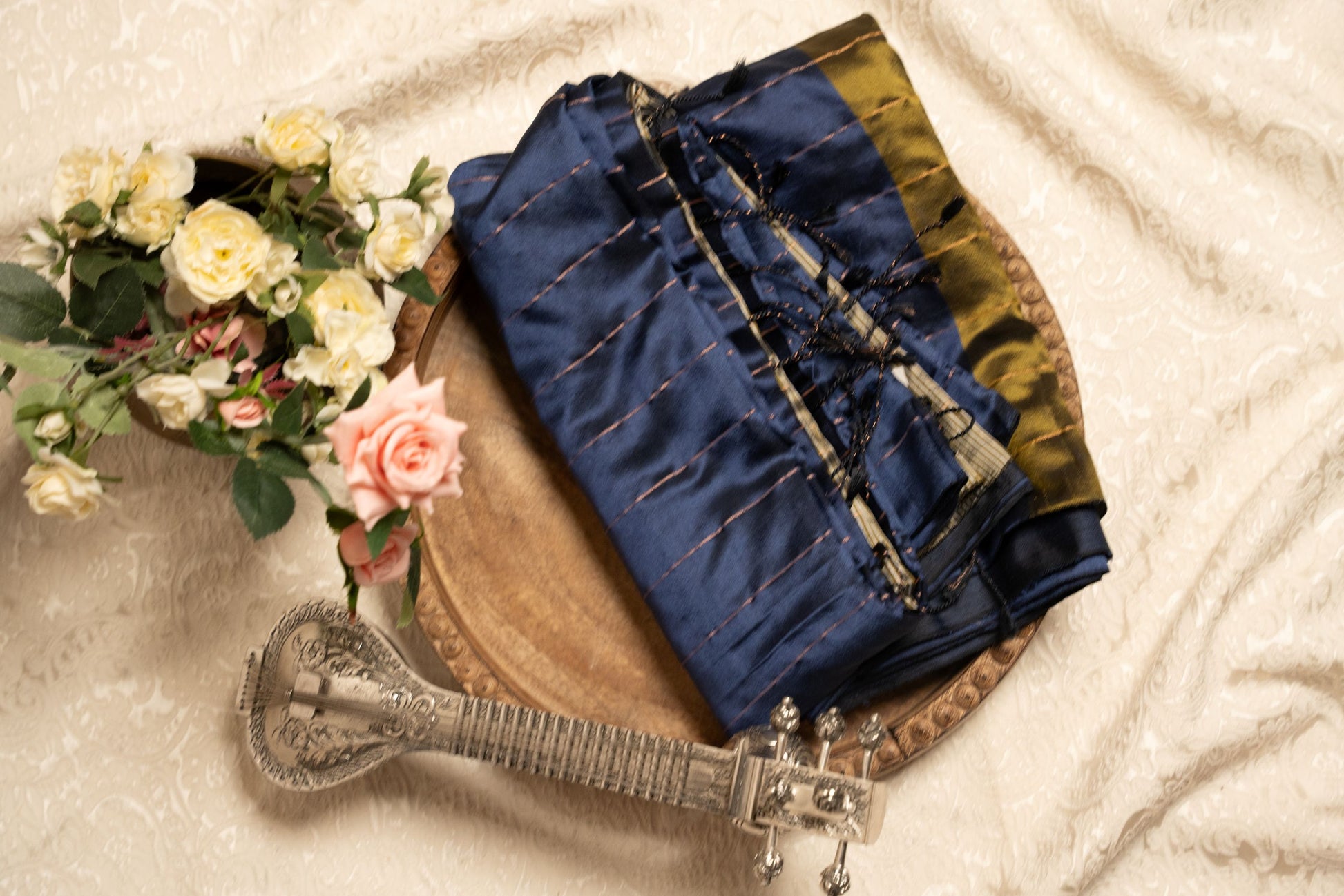 A striking blend of olive green and deep blue stripes on luxurious soft silk, this saree is a refined take on modern tradition. Light, fluid, and effortlessly graceful.