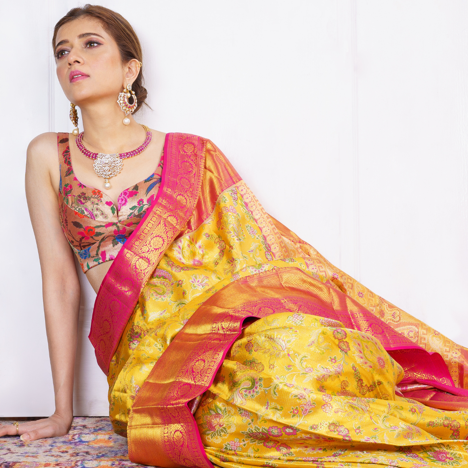 This Banarasi Silk Brocade Saree in Yellow is a magnificent flash of opulence, shimmering like a live piece of art and gleaming through abundant beauty. The rich yellow body is represented by pure gold zari floral patterns intertwined nestled inside golden zari floral vines self border. The lively pallu is stunningly decorated with pink border that are dripping with energy.